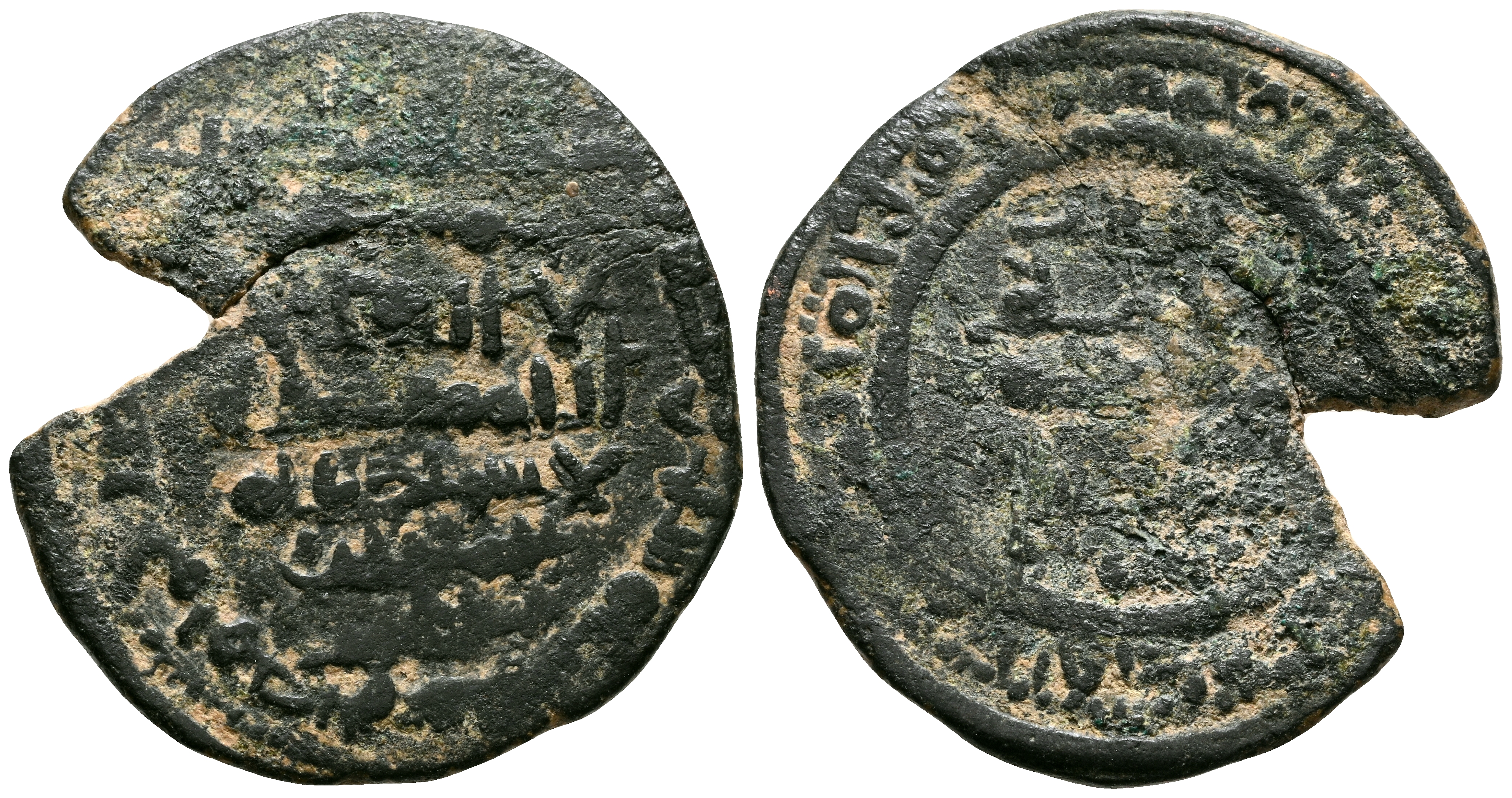 TAIFAS DEL CALIFATO, CEUTA. Saqqwut Al-Barghawati. Dirham. (Ae. 2,29g/21mm). 466H. Medina Sabta (Ceuta) / مدينة سبتة. (Vives 879; Prieto 126a). Citando a سقوت / المعان / المنصور (al-Mansūr/al-Mu'ān/Suqūt) en IA y العز / بها ، الدولة / الحاجب (al-hā y ib/Bahā al-Dawla/al-'Izz) en IIA. MBC-. Fraccionado. Raro.