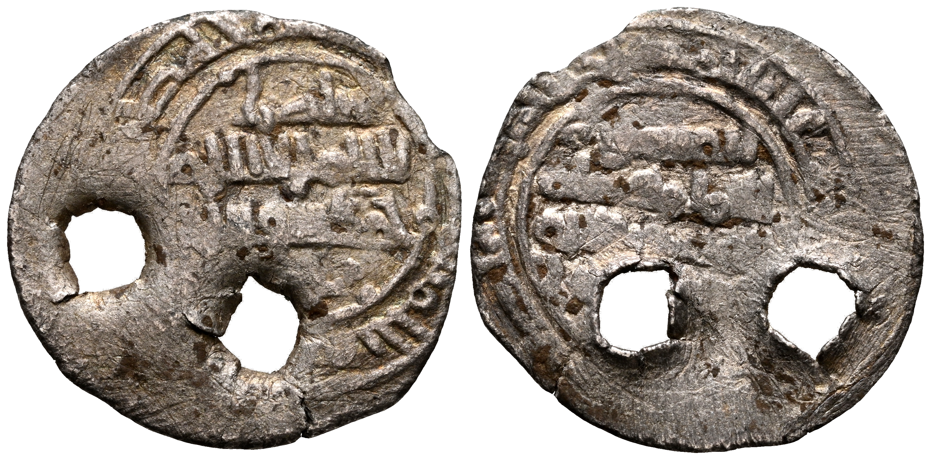 TAIFAS DEL CALIFATO, ALMERÍA (Amiríes de Valencia). Abd al-Aziz, al-Mansur. Fracción de Dirham. (Ar. 0,73g/16mm). 419-429H. al-Mariya (Almería) / المـرية. (Vives 1029-1030; Prieto 170b-d, Francés 63-65). Citando الناصر (al-Nasir)/ غلب (Galib) en IA. y المنصور (al-Mansur) en IIA. MBC-. Ceca perfectamente visible. Dos perforaciones. Raro ejemplar.