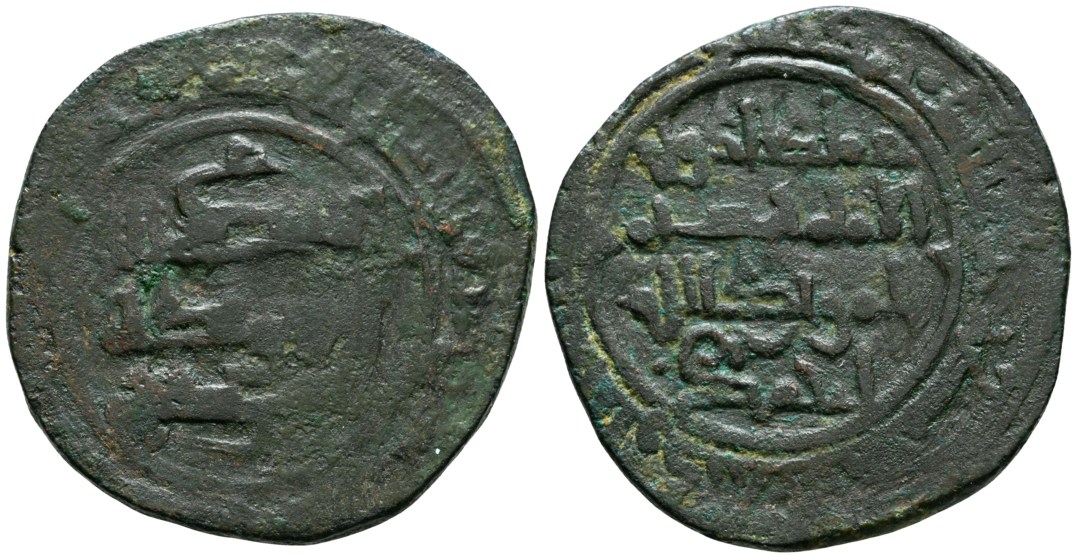 TAIFAS DEL CALIFATO, ZARAGOZA (Banu Hud). Imad al-Dawla Ahmad I Ibn Sulayman, al-Muqtadir. Dirham. (Ve. 5,62g/25mm). ¿472H? Saraqusta (Zaragoza) / سرقسطة. (Vives 1209; Prieto 268m). Letra ع ('Ayn) en IA. y cita عماد الدولة ('Imād al-Dawla) / احمد (A hmad) en IIA. MBC-. Raro ejemplar.