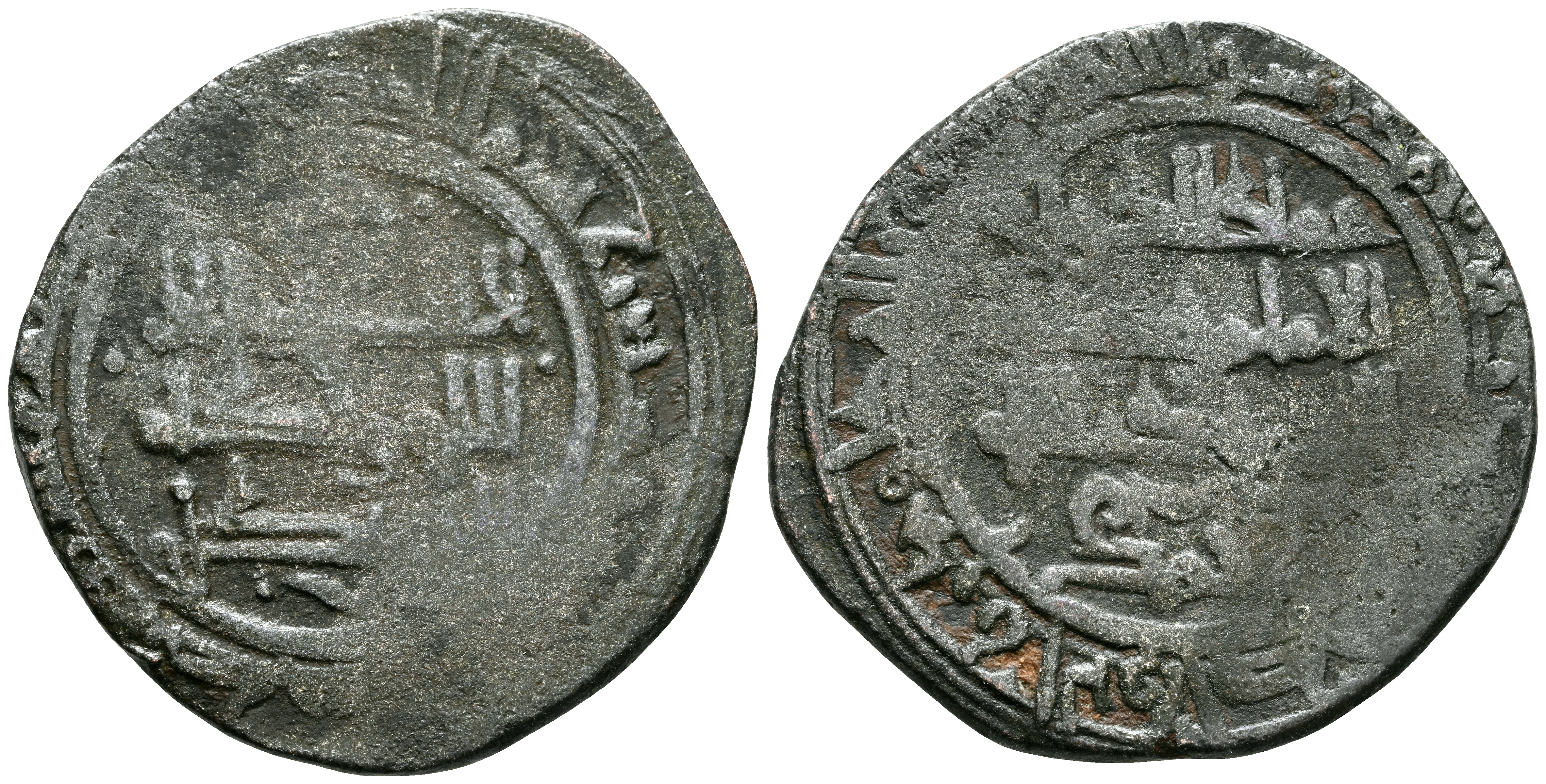TAIFAS DEL CALIFATO, ZARAGOZA (Banu Hud). Imad al-Dawla Ahmad I Ibn Sulayman, al-Muqtadir. Dirham. (Ve. 6,21g/26mm). 473H. Saraqusta (Zaragoza) / سرقسطة. (Vives 1211; Prieto 268n). Letra ع ('Ayn) en IA. y cita عماد الدولة ('Imād al-Dawla) / احمد (Ah mad) en IIA. MBC. Vanos de acuñación. Raro ejemplar. Incluye etiqueta con anotaciones y dibujos de época del antiguo coleccionista.