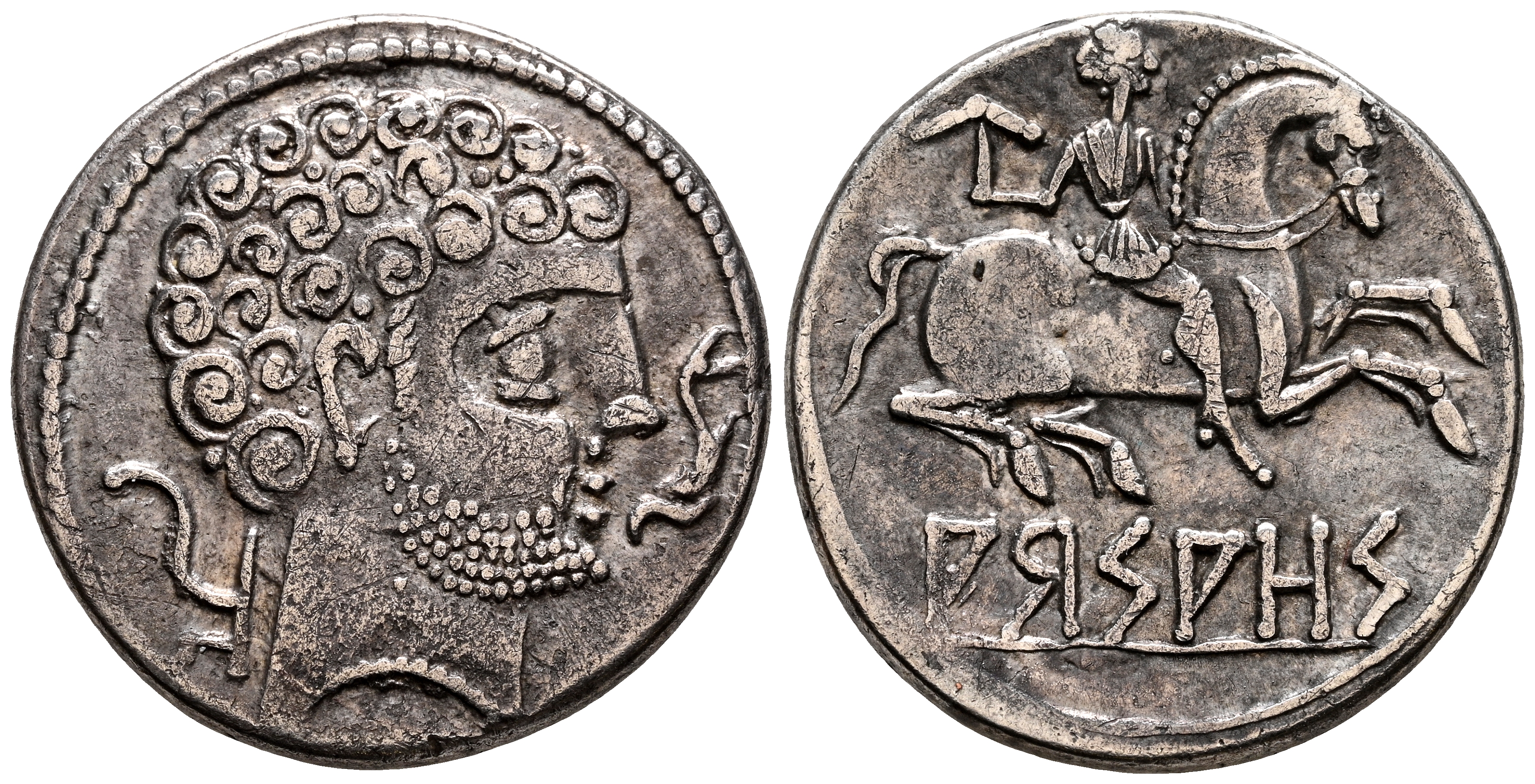 ARSAOS (Zona de Navarra). Denario. (Ar. 3,93g/18mm). 120-80 a.C. (FAB-139). Anv: Cabeza masculina barbada a derecha, delante delfín, detrás arado. Rev: Jinete con dardo a derecha, debajo leyenda ibérica sobre línea: ARSAOS. MBC+. Atractivo y escaso ejemplar así.