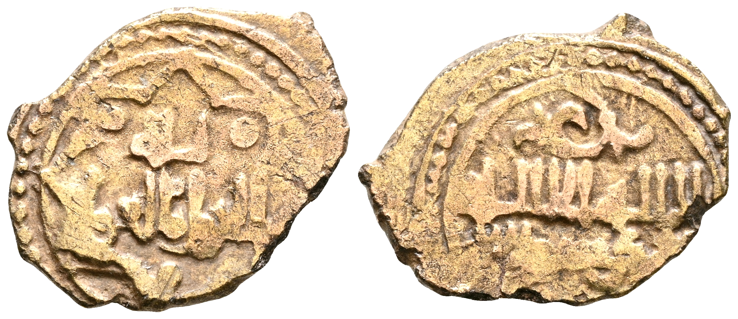 TAIFAS DEL CALIFATO, Anónimo atribuído a Toledo. Fracción de Dinar. (El. 0,64g/14mm). S/D. (Codera y Zaidin (1897) 1047 bis; Ibrahim, Cantó (2003) Suplemento a los Reinos de Taifas, nº 169, Francés nº362). Anv: لااله الاالله / محمدرسول الله. Reverend o: الح و ل و القوة / الله. (Para Dios / el poder y la fuerza). MBC. Escasa.Codera atribuyó esta pieza a Almería ''por tener alguna semejanza con algunos ejemplares del nº 1047 de Vives, aunque en el tesorillo donde aparecieron aquellos ejemplares, ta mbién contenía otros diferentes de las taifas de Toledo, Badajoz, Córdoba, Valéncia, Dénia y Zaragoza. Sin embargo, precediendo la intuición del doctor Albert Cantó, sería David Francés quien daría un razonamiento más lógico a su origen, en su libro ''De la legitimidad, las sucesiones y su reflejo en las acuñaciones andalusíes'' pág. 137-139, justificando la atribución de esta pieza a Toledo, durante la presencia de 'Umar al-Mutawakkil rey de Badajoz'.