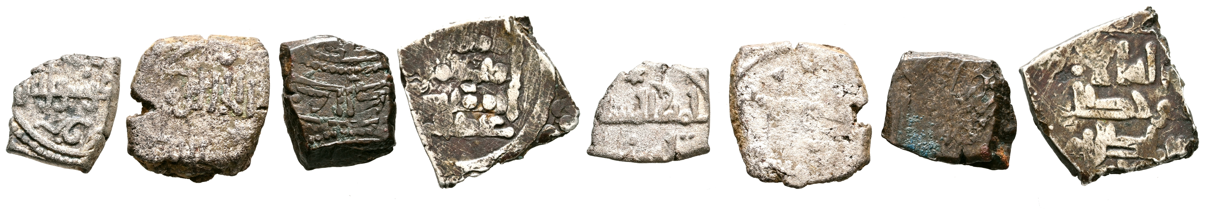 TAIFAS DEL CALIFATO-ALMORAVIDES. Interesante conjunto formado por 4 fracciones de dirhams / handúes. Diferentes tipos, medidas y estados de conservación. A EXAMINAR.