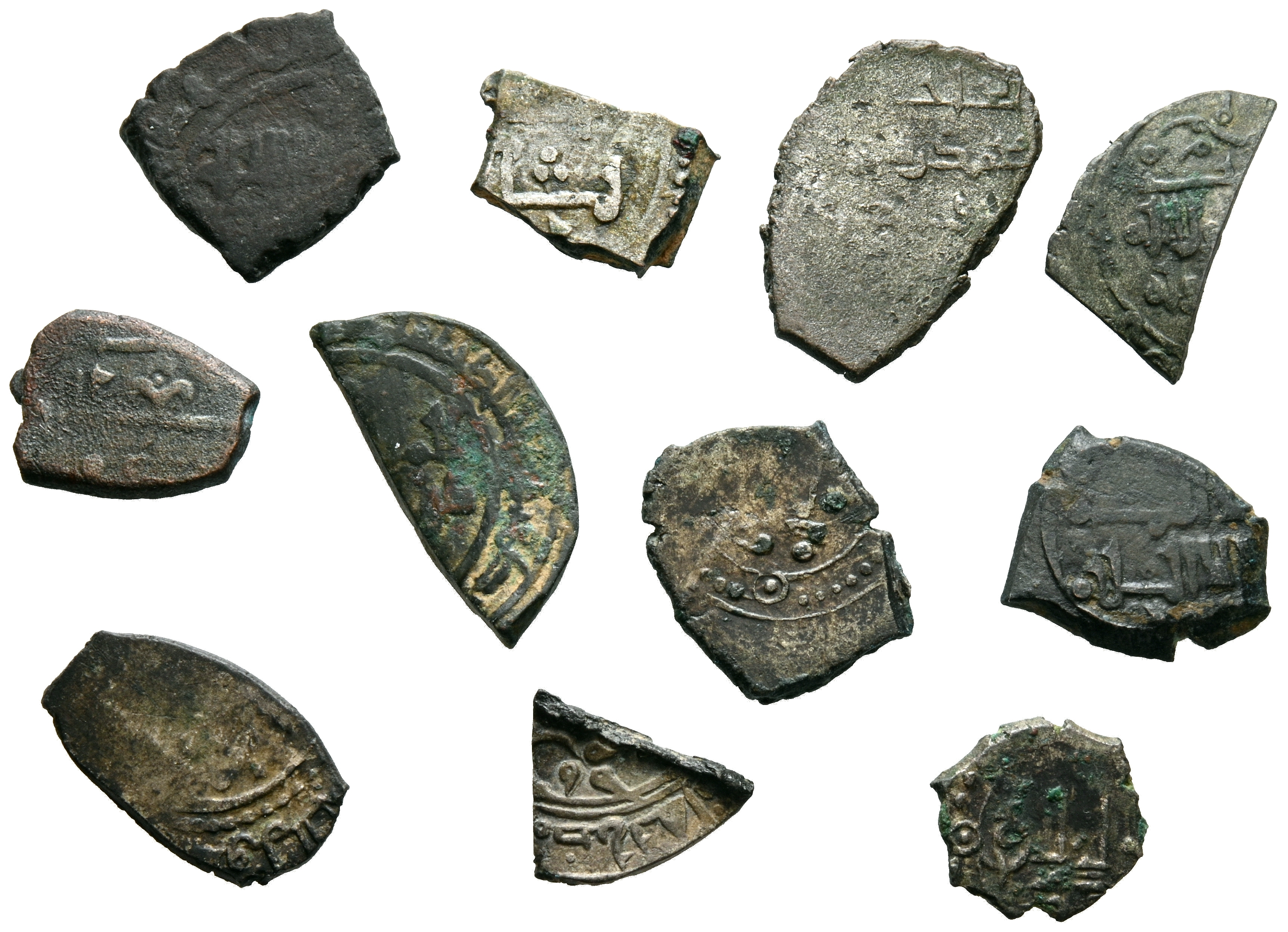 TAIFAS DEL CALIFATO. Interesante conjunto formado por 11 dírhams fraccionarios o handúes, principalmente de la Taifa de Toledo. Diferentes módulos, medidas y calidades. A EXAMINAR.