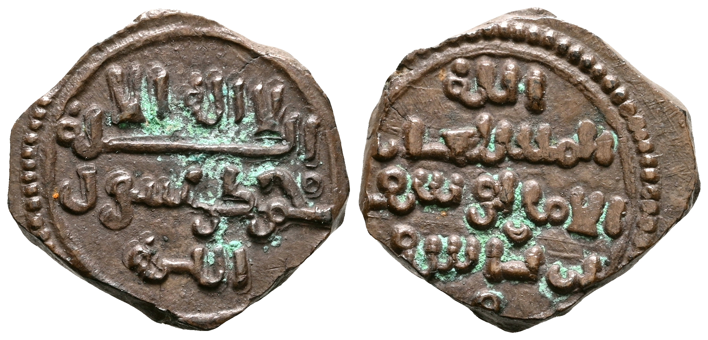 ALMORAVIDES, Yusuf ben Tashfin (480-500H). Quirate de cobre. (Ae. 0,95g/12mm). S/D. (Vives no cita; Martínez 2; Eustache 84; Benito Ba16). Anv: 'Shahadah' en cuatro líneas. Rev: Presenta a Yusuf con el título de al-Musta'in bi-Allah arriba divido en dos lines: المستعين / بالله. MBC-. Cospel irregular. Rara. Este tipo de Yusuf junto con algunas variantes de Quirate de Ali, son los únicos tipos de todo el periodo almorávide que contiene el título de al-Musta'in bi-Allah ("el que pide la ayuda de D ios").