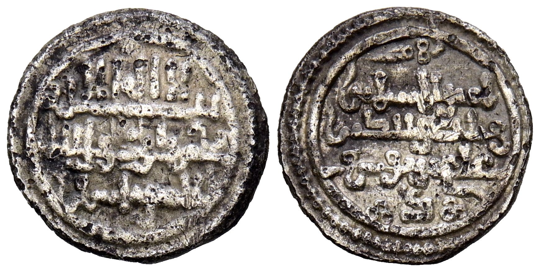 ALMORAVIDES, Ali ben Yusuf y el Amir Tashfin (533-537H). Quirate. (Ar. 0,94g/12mm). S/D. (Vives 1824; Benito Cj3). Anv: 'Shahadah' en tres líneas, abajo cita al heredero Tashufin. Rev: Divido en tres líneas, presenta a Ali con títulos de Amir al-Muslimin y Nasir al-Din. MBC-/MBC.