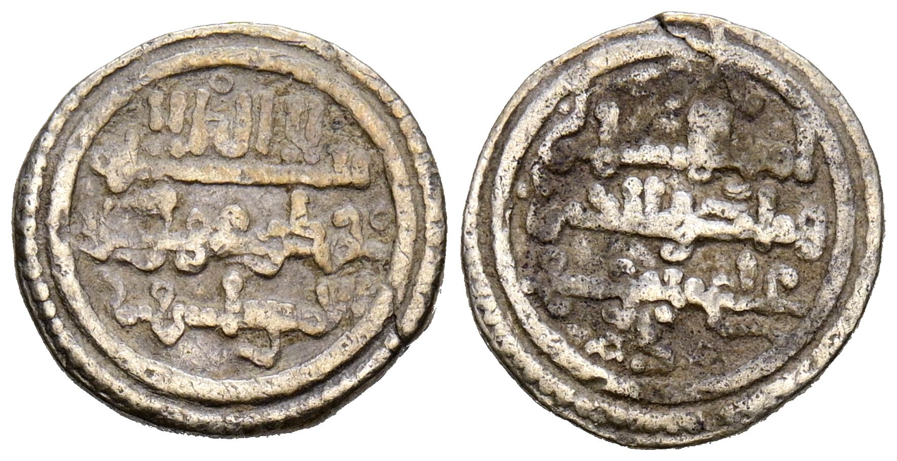 ALMORÁVIDES, Ali ben Yusuf y el emir Tashfin (533-537H). Quirate. (Ar. 0,98g/12mm). S/D. (Vives 1824; Medina 139; Benito Cj3). Anv: 'Shahada' en tres líneas, debajo mención al heredero: الامير تاشفين. Rev: Presenta a Ali con títulos de Amir al-Muslim in y Nasir al-Din. MBCº.