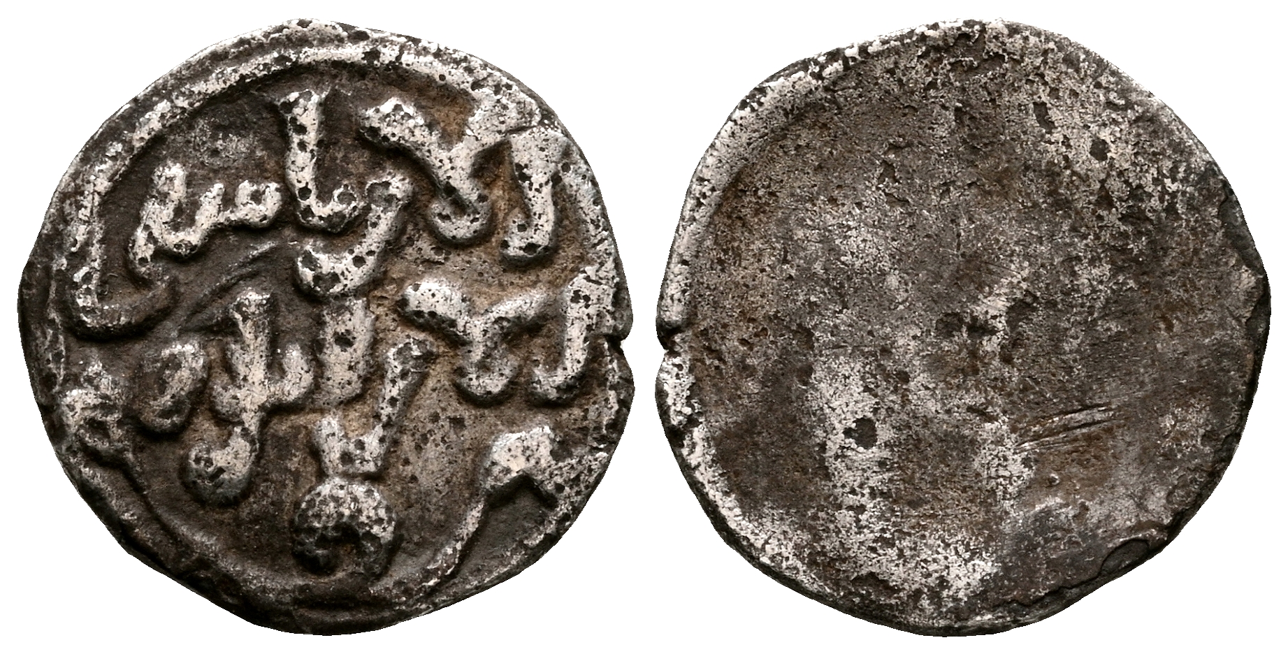 ALMORÁVIDES, Tashfin ben Ali y el Emir Ibrahim (539-540H). 1/2 Quirate. (Ar. 0,38g/9mm). S/D. Anv: 'Shahada' en tres líneas, debajo mención al heredero: الامير ابرهيم. Rev: Anepígrafo. MBC. Porosidad. Inédita.
