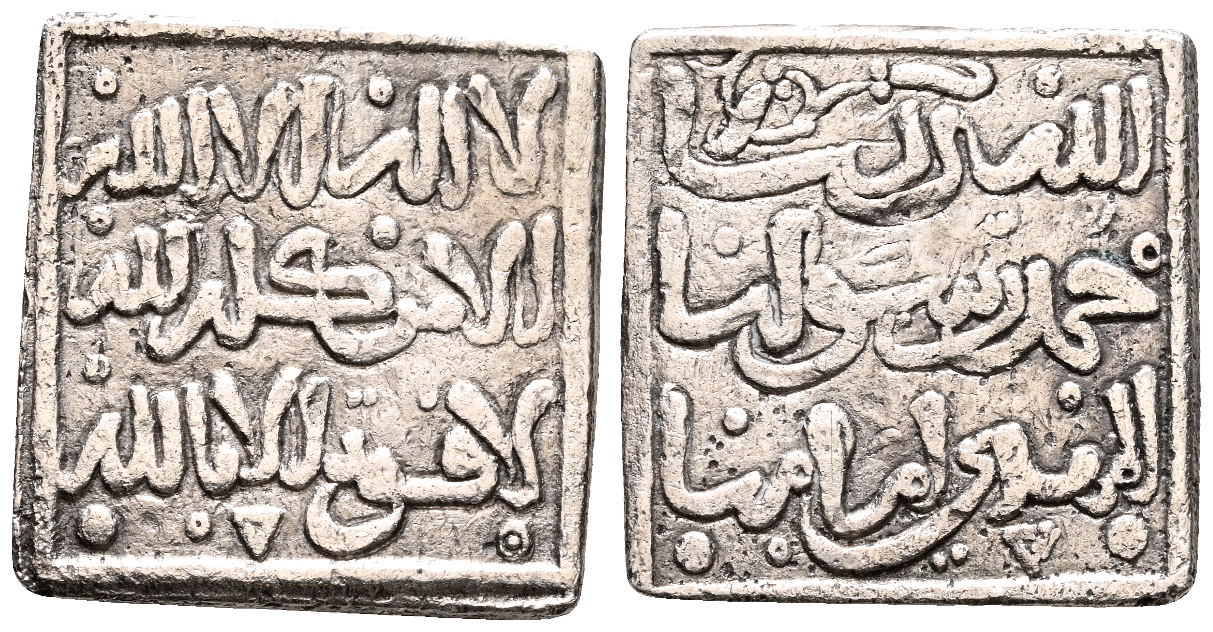 ALMOHADES, Anónima citando a Al-Mahdi. Dirham. (Ar. 1,17g/12mm). S/D. (Tipos Vives 2088; Medina 201.a; Hohertz 578). Interesante ejemplar que a pesar de su corto peso, contiene decoración de puntos y un diminuto triángulo, en el lugar de ceca en amba s areas. EBC-.