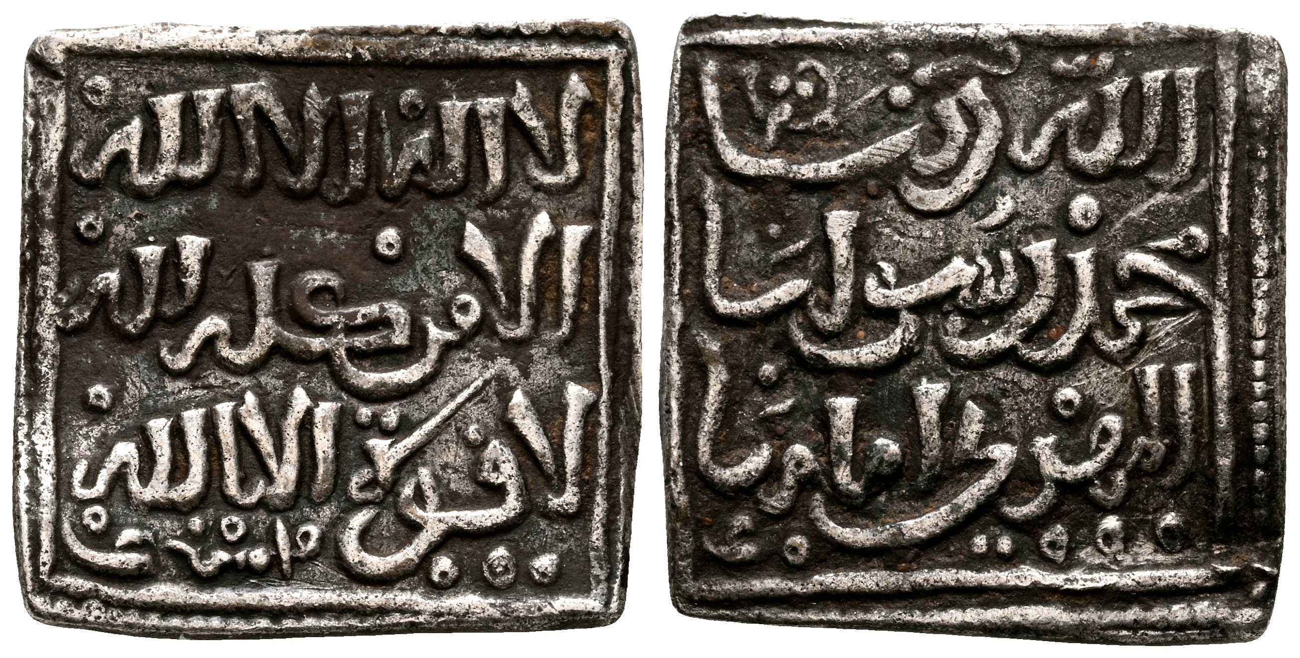 ALMOHADES. Anónimo a nombre del imán Al-Mahdi. Dirham, copia africana de época. (Ar. 1,49g/13mm). Fez / فاس. (Vives tipo 2107 y Hohertz tipo 601b). MBC. Alabeada. Interesante variante. Singularmente, además de los típicos roeles, esta pieza contiene en la esquina inferior izquierda de ambas áreas, un diminuto adorno en forma de ''ʿayn'' inicial y que posiblemente se trate de una marca de conteo.
