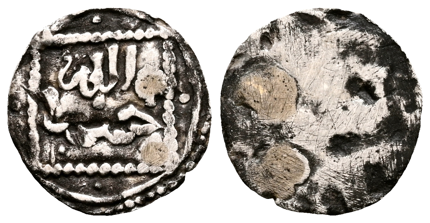ALMOHADES, Anónimo. 1/16 Dirham de tipo almorávide. (Ar. 0,08g/7mm). S/D. Anv: الله / حسبنا (Dios me basta). Rev: Anepígrafo. MBC. Dos perforaciones reparadas. Muy rara. Este raro divisor a medio camino entre la tradicional forma redonda del Quirate y la leyenda del 1/8 de Dirham almohade cuadrado (Hohertz 645), contiene en su diseño algunas características similares a los 1/2 Dirhams redondos atribuídos por Peña Martín a Idris I (Hohertz 633 y notas).