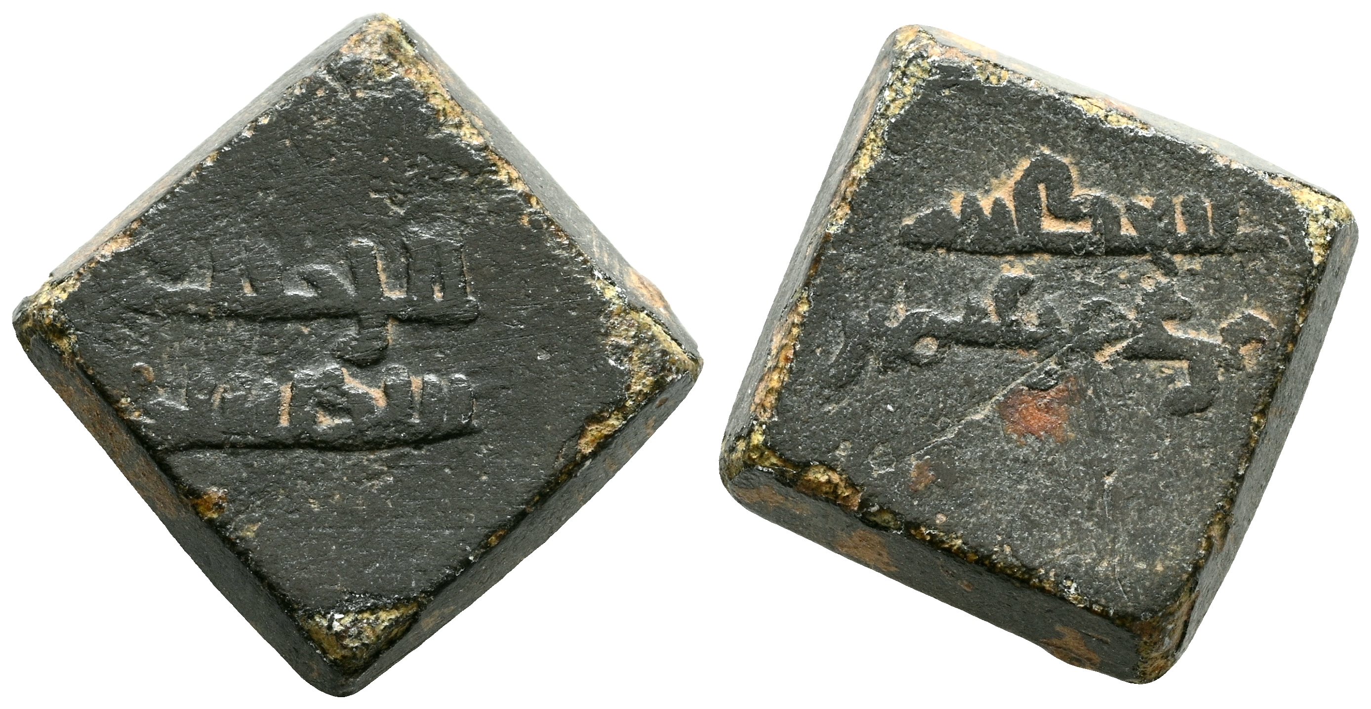 Ponderal de Dinar. (Ae. 3,60g/11mm). Sin fecha. Forma cuadrada con epigrafía cúfica. (Tonegawa Tipo-D40,var). Anv: عبد ألله (Abd Allah) / العدل لله (La justicia es de Dios). Rev: عبد ألله (Abd Allah) / عمل عثمان (Obra de 'Uṯmān). MBC+.