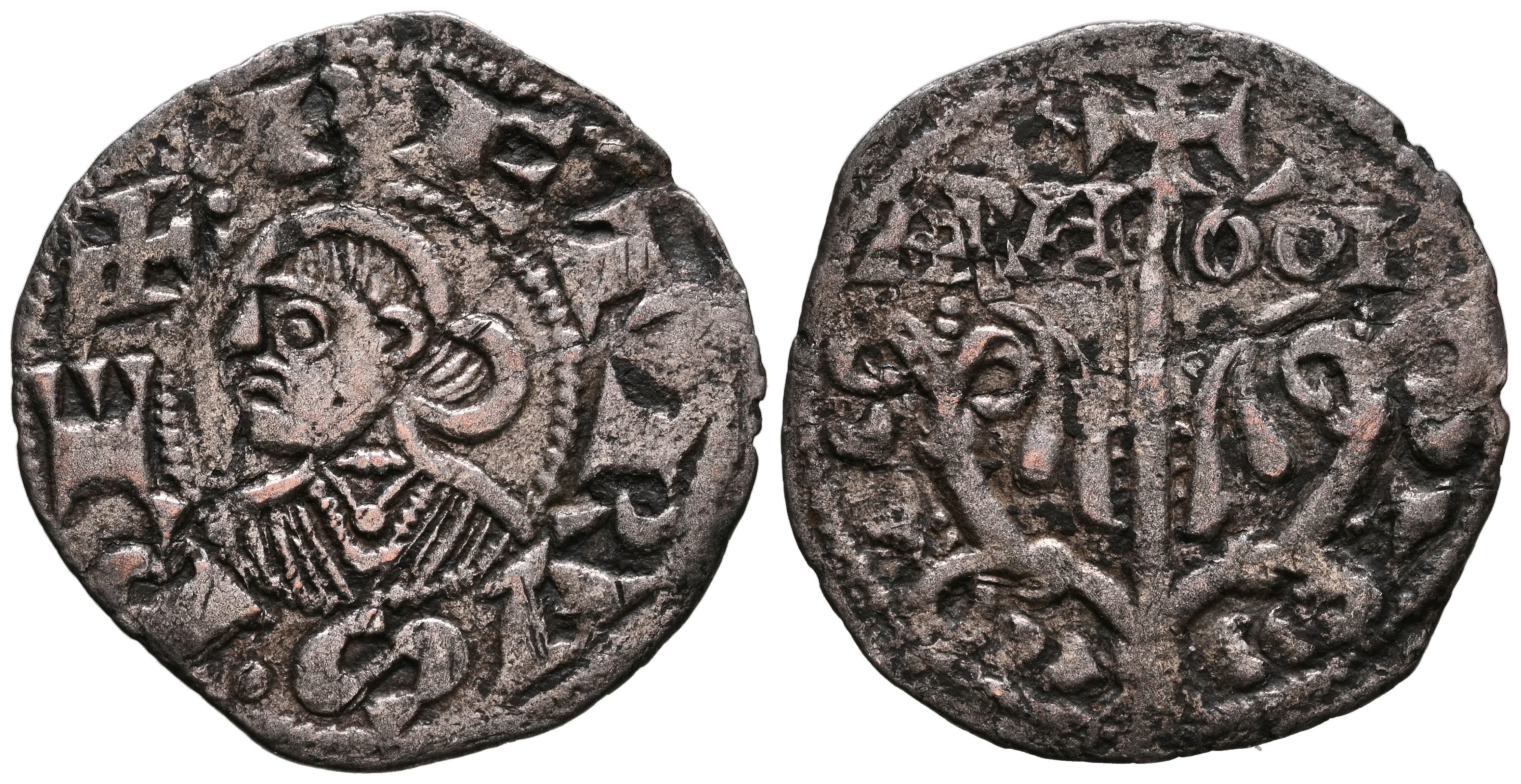 PEDRO EL DE HUESCA (1094-1104). Dinero. (Ve. 0,78g/18mm). Jaca. (Cru. V.S. 213). Anv: Busto de Pedro a izquierda, alrededor leyenda: PETRVS REX. Rev: Árbol superado de cruz, a los lados leyenda: ARA-GON. MBC. Escasa.
