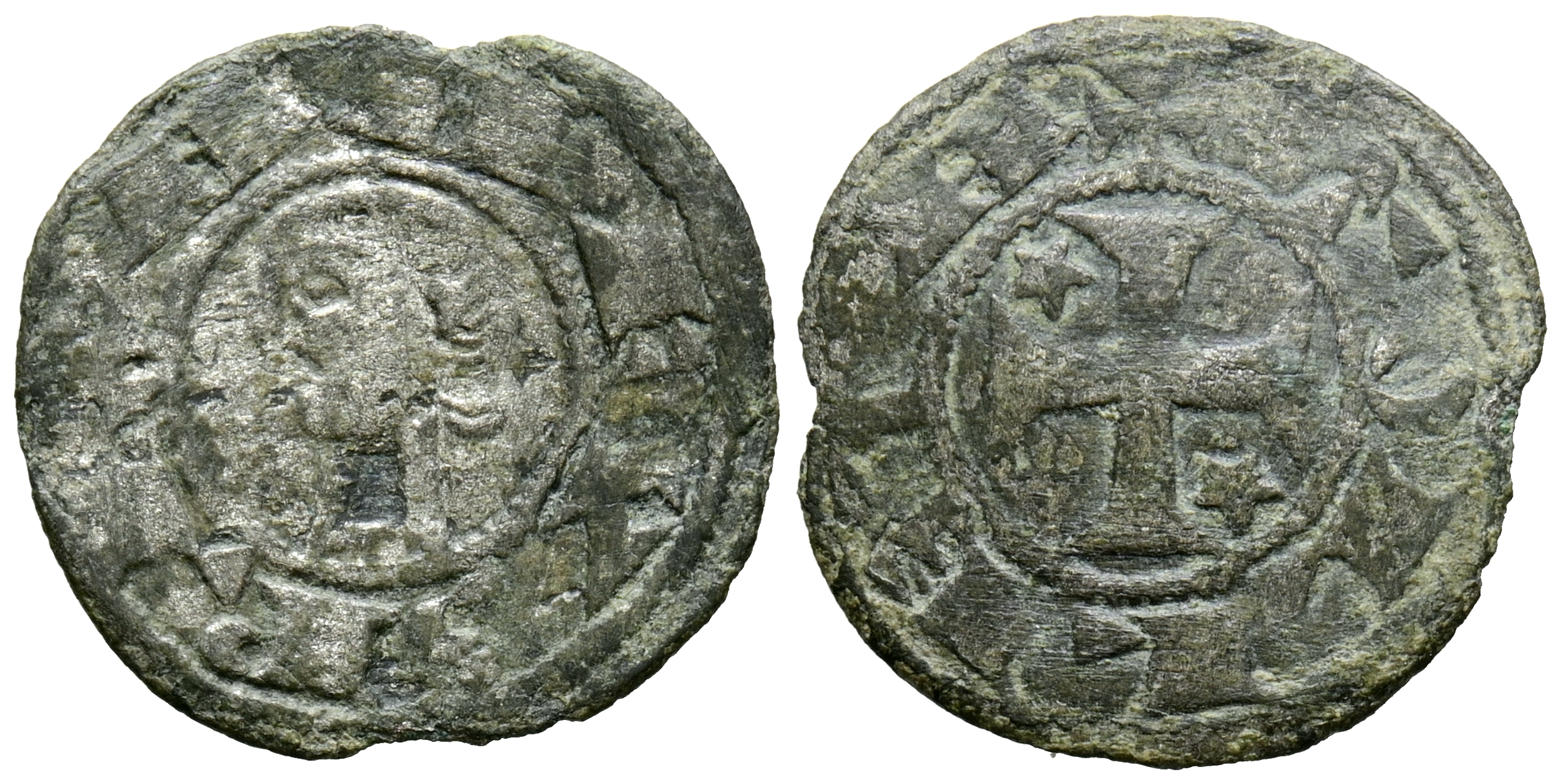 ALFONSO VIII (1158-1214). Dinero. (Ve. 0,79g/18mm). Taller itinerante de batalla. (Imperatrix A8:28.2; FAB-23, como Alfonso I de Aragón). Anv: Cabeza desnuda de Alfonso VIII a izquierda dentro de gráfilar circular, alrededor leyenda: ANFVS REX. Rev: Cruz patada con estrella y con punto central en 1º y 4º cuadrante, todo dentro de gráfila circular, alrededor leyenda: TOLLETA. MBC. Alabeada.