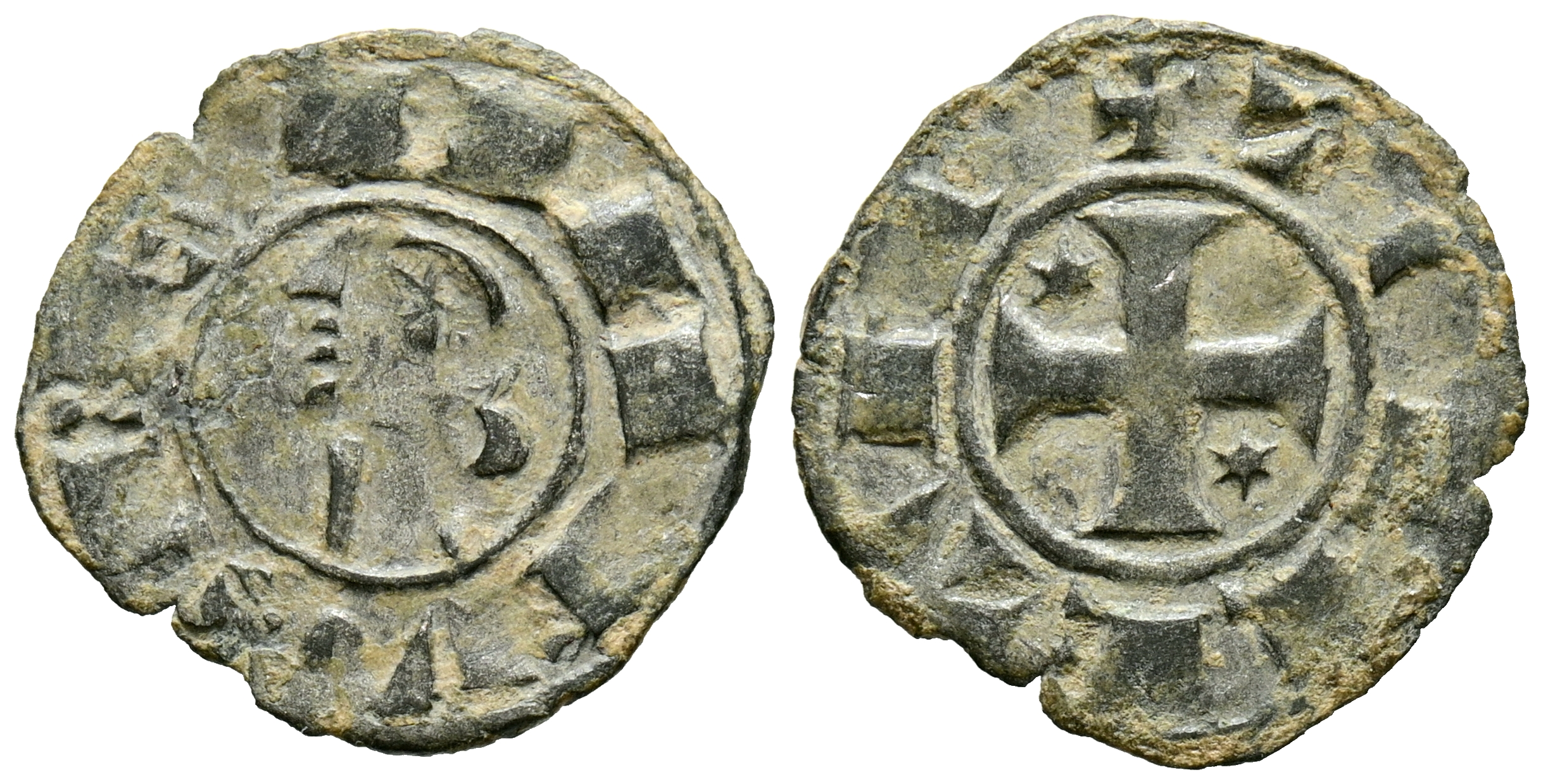 ALFONSO VIII (1158-1214). Dinero. (Ve. 0,68g/17mm). Taller itinerante de batalla. (Imperatrix A8:38.1; FAB-23 como Alfonso I de Aragón). Anv: Busto a izquierda dentro de gráfilar circular, alrededor leyenda: ANFVS REX. Rev: Cruz patada con roel estrellado en primer y cuarto cuadrante, todo dentro de una gráfila circular, alrededor leyenda: TOLLETA. MBC.