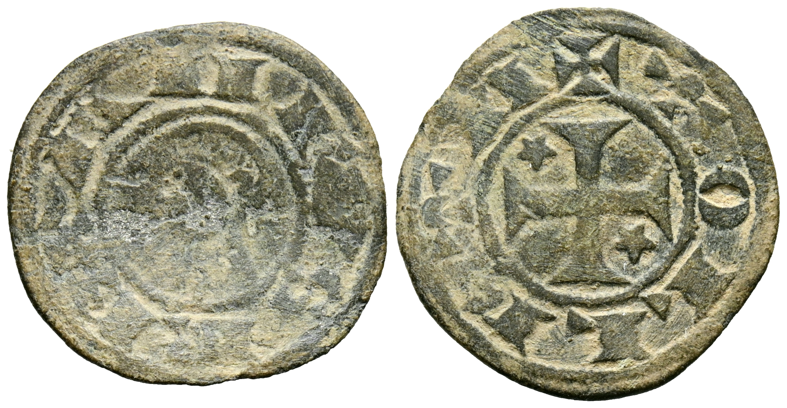 ALFONSO VIII (1158-1214). Dinero. (Ve. 1,06g/18mm). Taller itinerante de batalla. (Imperatrix A8:28.1; FAB-23 como Alfonso I de Aragón). Anv: Busto a izquierda dentro de gráfilar circular, alrededor leyenda: ANFVS REX. Rev: Cruz patada con roel estrellado en primer y cuarto cuadrante, todo dentro de una gráfila circular, alrededor leyenda: TOLLETA. MBC+.
