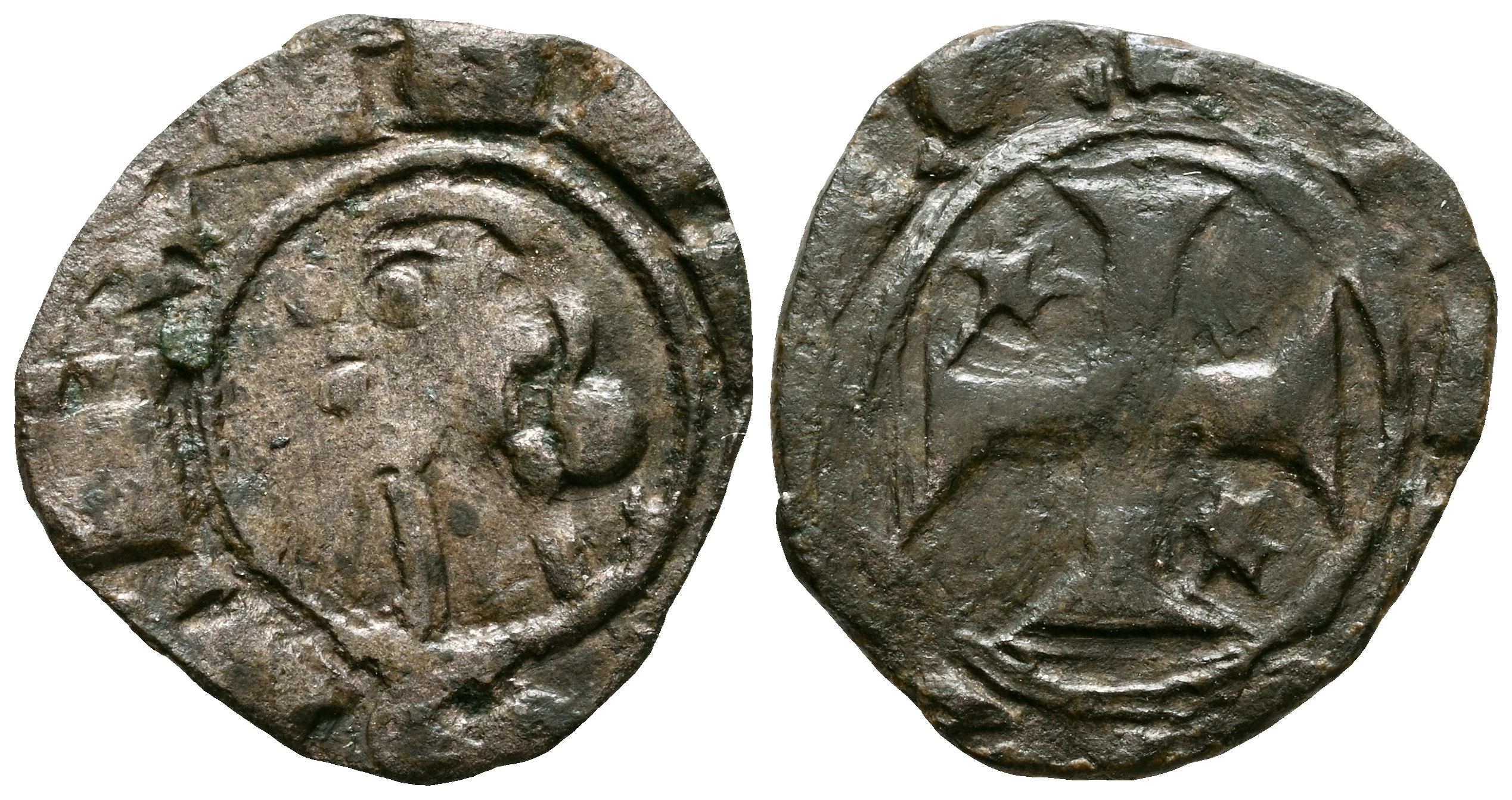 ALFONSO VIII (1158-1214). Óbolo-Meaja. (Ve. 0,49g/13mm). Toledo. (FAB-24, como Alfonso I). Anv: Busto de Alfonso VIII a izquierda, alrededor leyenda: ANFVS REX. Rev: Cruz patada con estrella en 1º y 4º cuadrante, alrededor leyenda: TOLLETA. MBC. Escasa.