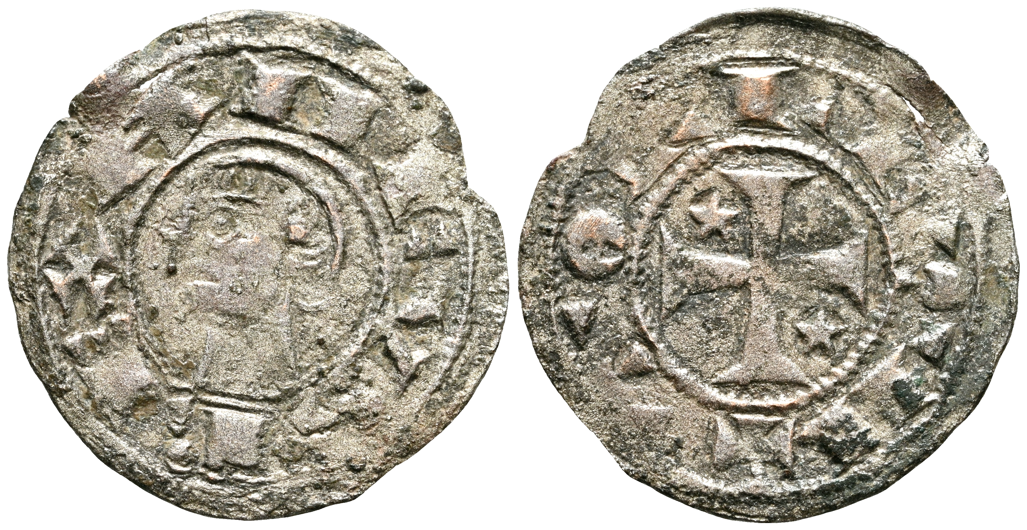 ALFONSO VIII (1158-1214). Dinero. (Ve. 0,79g/18mm). Toledo. (FAB-25.3, como Alfonso I de Aragón). Anv: Busto a izquierda dentro de gráfilar circular, alrededor leyenda: ANFVS REX. Rev: Cruz patada con estrella en primer y cuarto cuadrante, todo dentro de una gráfila circular, alrededor leyenda: TOLLETA. MBC.