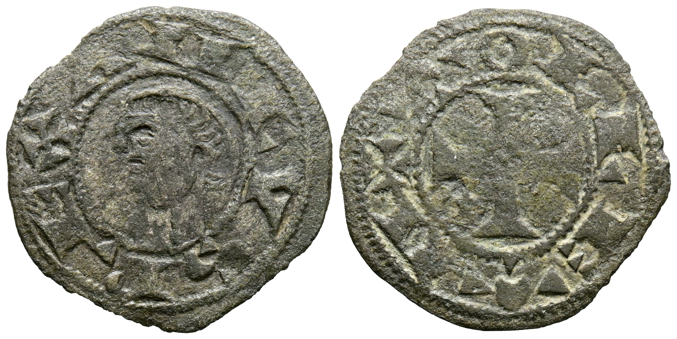 ALFONSO VIII (1158-1214). Dinero. (Ve. 0,90g/17mm). Toledo. (Imperatrix A8; FAB-25.3 como Alfonso I de Aragón). Anv: Busto a izquierda dentro de gráfilar circular, alrededor leyenda: ANFVS REX. Rev: Cruz patada con estrella en primer y cuarto cuadrante, todo dentro de una gráfila circular, alrededor leyenda: TOLLETA. MBC.