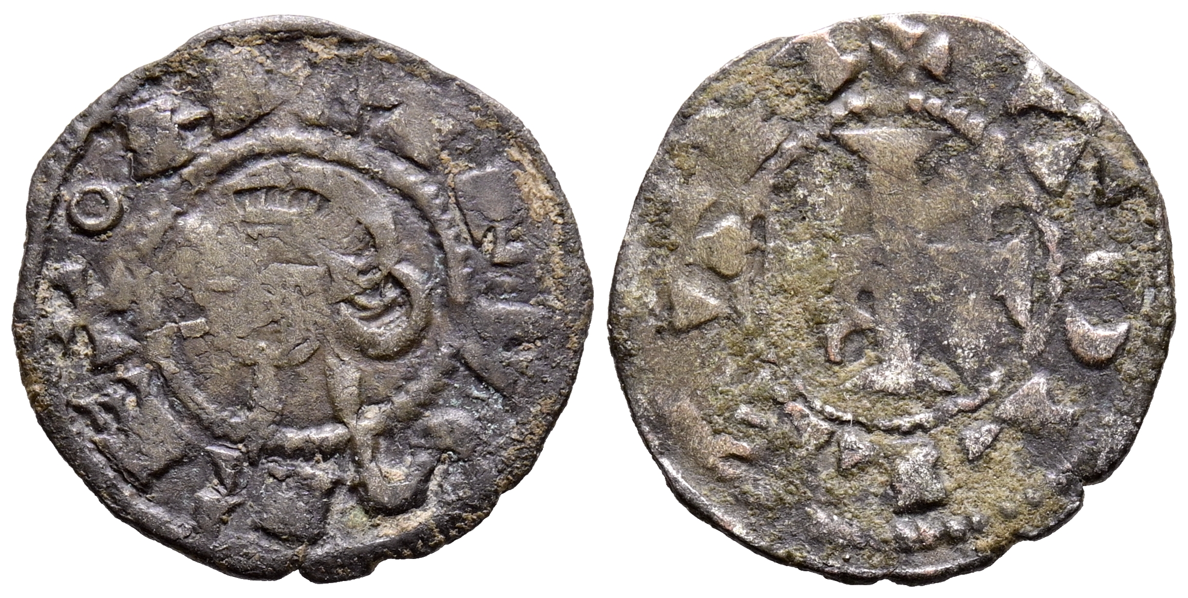 ALFONSO VIII (1158-1214). Dinero. (Ve. 0,75g/16mm). Taller itinerante de batalla. (Imperatrix A8:29.9; FAB-25.3 como Alfonso I de Aragón). Anv: Busto a izquierda dentro de gráfilar circular, alrededor leyenda: ANFVS REX. Rev: Cruz patada con roel estrellado en primer y cuarto cuadrante, todo dentro de una gráfila circular, alrededor leyenda: TOLLETA. MBC.