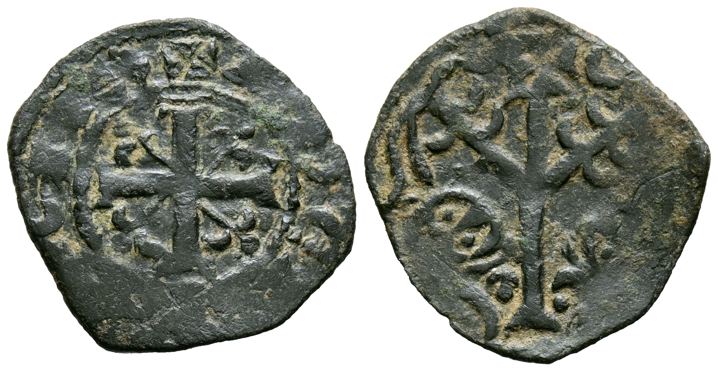 ALFONSO IX (1188-1230). Dinero. (Ve. 0,74g/16mm). Marca de ceca doble crecientes lateral. (Imperatrix A9:1.16; FAB-144.1). Anv: Cruz patada con veros sobre vástagos en los cuarteles, alrededor leyenda: ILDEFONS REX. Rev: Arbol, entre dos leones enfrentados. MBC+. Alabeada.