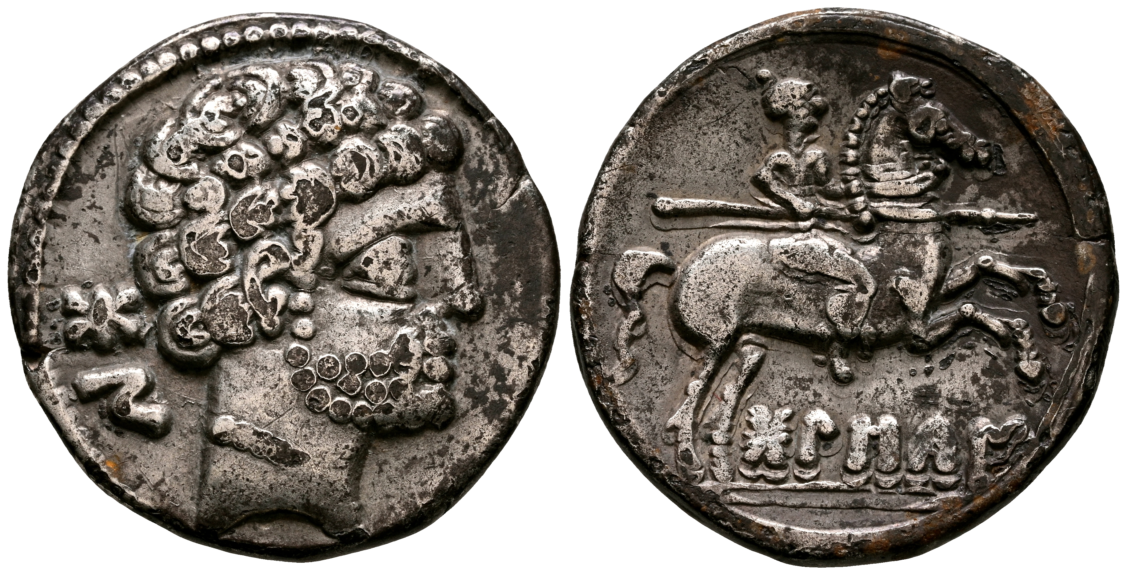 BOLSCAN (Huesca). Denario. (Ar. 3,63g/19mm). 180-20 a.C. (FAB-1911). Anv: Cabeza masculina barbada a derecha, detrás letras ibéricas: BoN. Rev: Jinete con lanza a derecha, debajo leyenda ibérica: BoLSCaN. MBC.