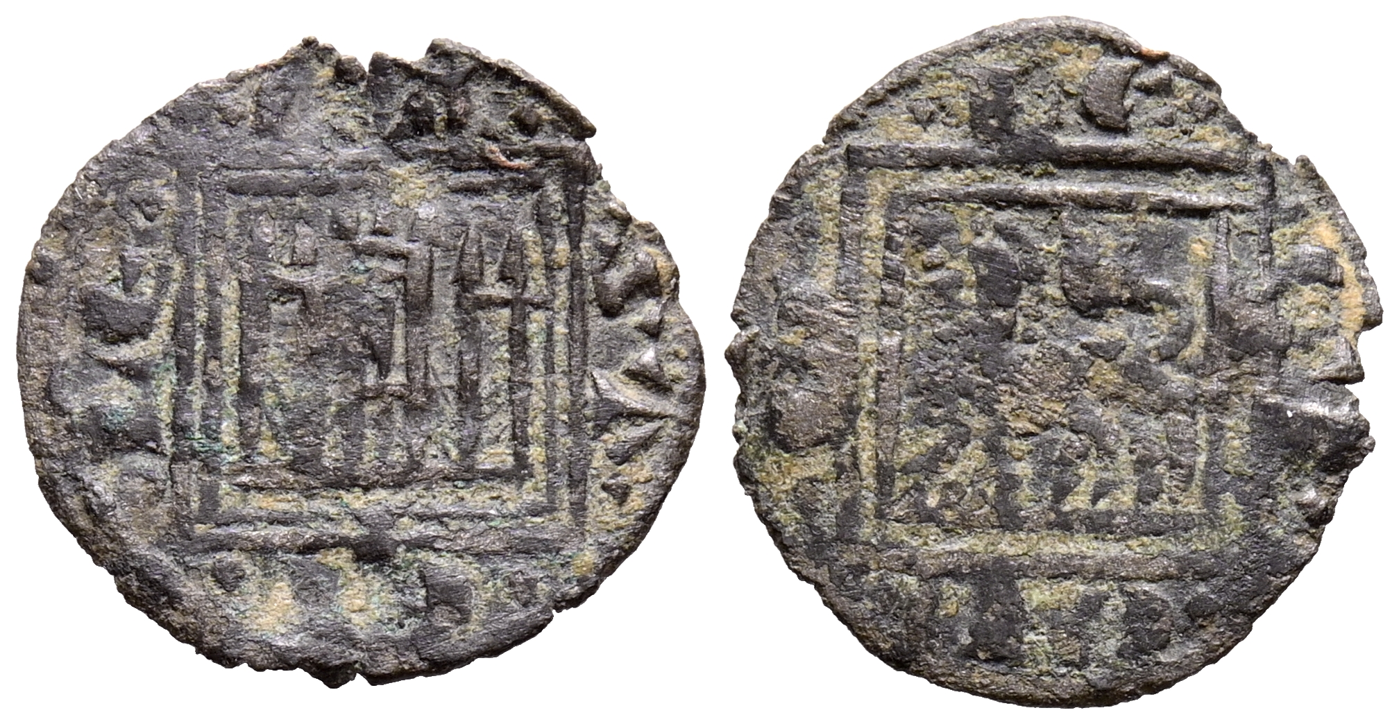 Alfonso X (1252-1284). Obolo. (Ve. 0,42g/14mm). Santiago de Compostela o Coruña. (Imperatrix A10:14.32; FAB-280.1). Anv: Castillo, debajo: venera, todo dentro de gráfila cuadrada, alrededor leyenda: CASTELLE. Rev: León estante a izquierda dentro de gráfila cuadrada, alrededor leyenda: LEGIONIS. MBC-.