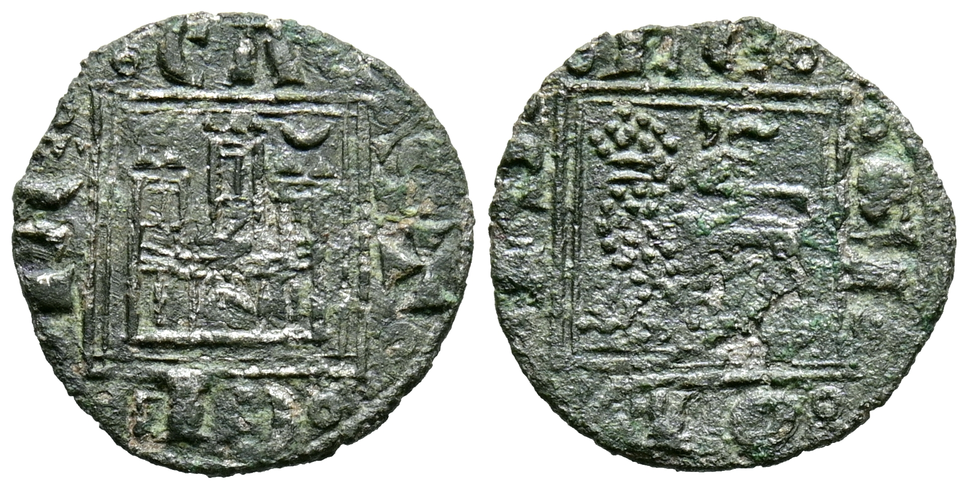 ALFONSO X (1252-1284). Pugesa/Obolo. (Ve. 0,46g/13mm). Marca de ceca Creciente. (Imperatrix A10:14.43; FAB-288). Anv: Castillo, sobre la torre derecha Creciente, todo dentro de gráfila cuadrada, alrededor leyenda: CASTELLE. Rev: León pasante a izquierda dentro de gráfila cuadrada, alrededor leyenda: LEGIONIS. MBC.