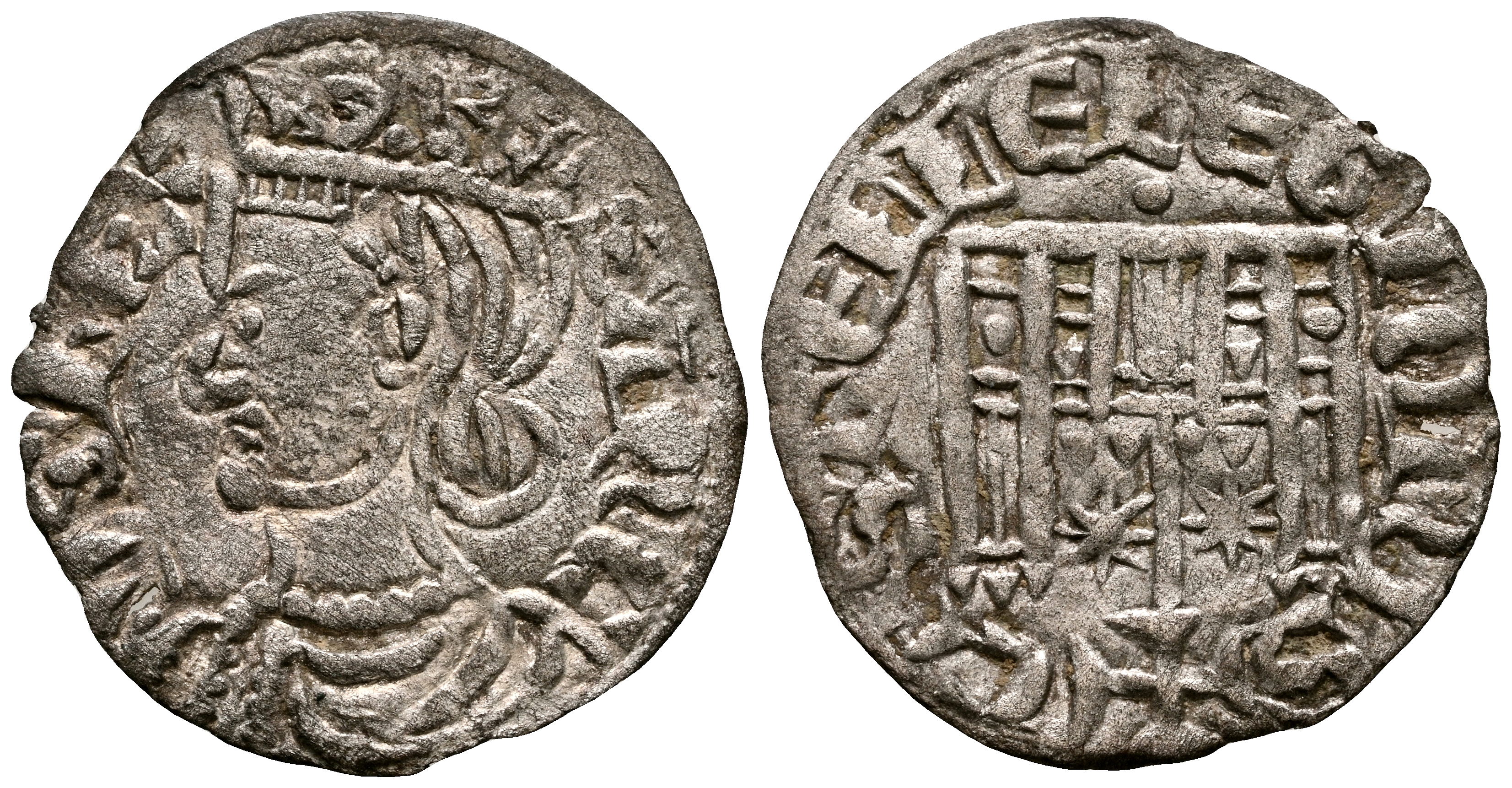 SANCHO IV (1284-1295). Cornado. (Ve. 0,47g/17mm). Ceca indeterminada, marca de punto. (Momeca 43.1A10.2; FAB-305). Anv: Busto coronado de Sancho IV a izquierda y estrella sobre la corona, alrededor leyenda: SANCII REX. Rev: Castillo con cruz sobre vástago central entre estrellas, debajo punto como marca de ceca, alrededor leyenda: CASTELLE E LEGIONIS. MBC+. Rara y más así.