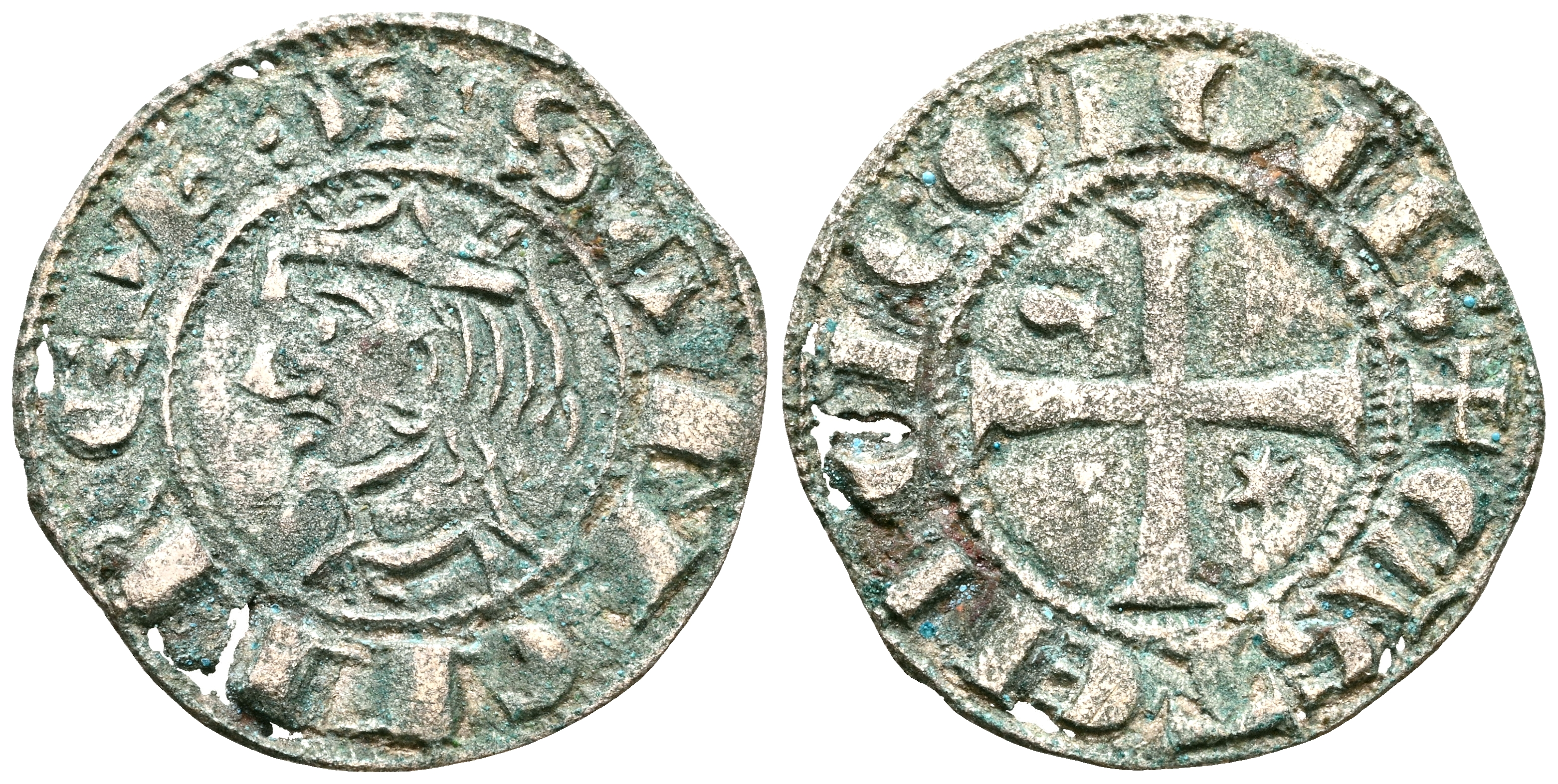 SANCHO IV (1284-1295). Meaja Coronada. (Ve. 0,58g/16mm). Coruña. (Momeca 43.2A3.3; FAB-309.4, como seisén; Roma-Rueda (2025) 75, mismo ejemplar). Anv: Busto coronado de Sancho IV a izquierda, alrededor leyenda: SANCII REX. Rev: Cruz patada con estrella en segundo cuadrante y venera en el cuarto cuadrante, alrededor leyenda: CASTELLE LEGIONIS. MBC.Ex colección Orol.