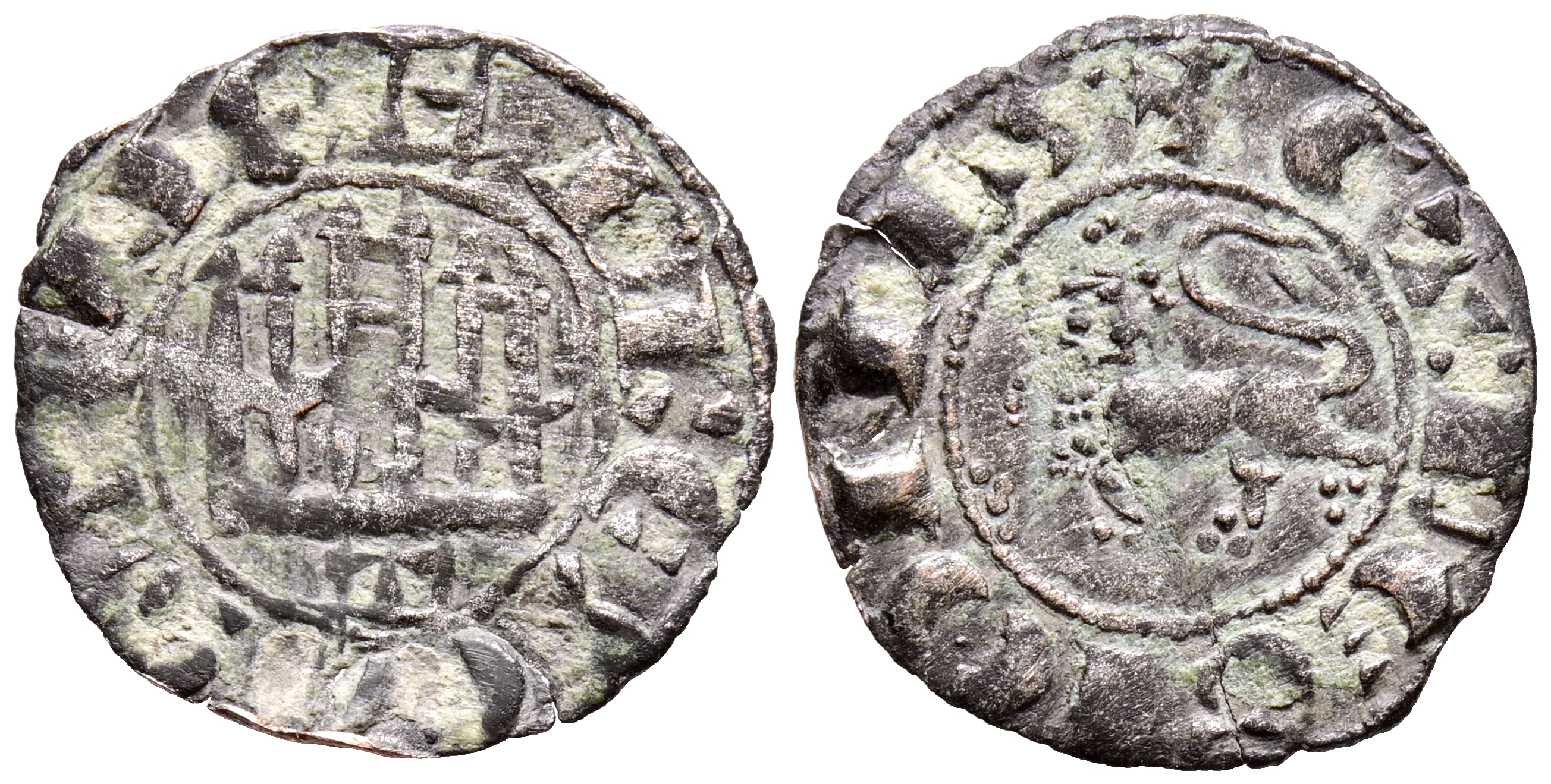 FERNANDO IV (1295-1312). Dinero. (Ve. 0,70g/18mm). Toledo. (Imperatrix F4:2.33; FAB-326, como pepión). Anv: Castillo, debajo T, todo dentro de gráfila circular, alrededor leyenda: F REX CASTELLE. Rev: León rampante a izquierda dentro de gráfila circular, alrededor leyenda: ET LEGIONIS. MBC.