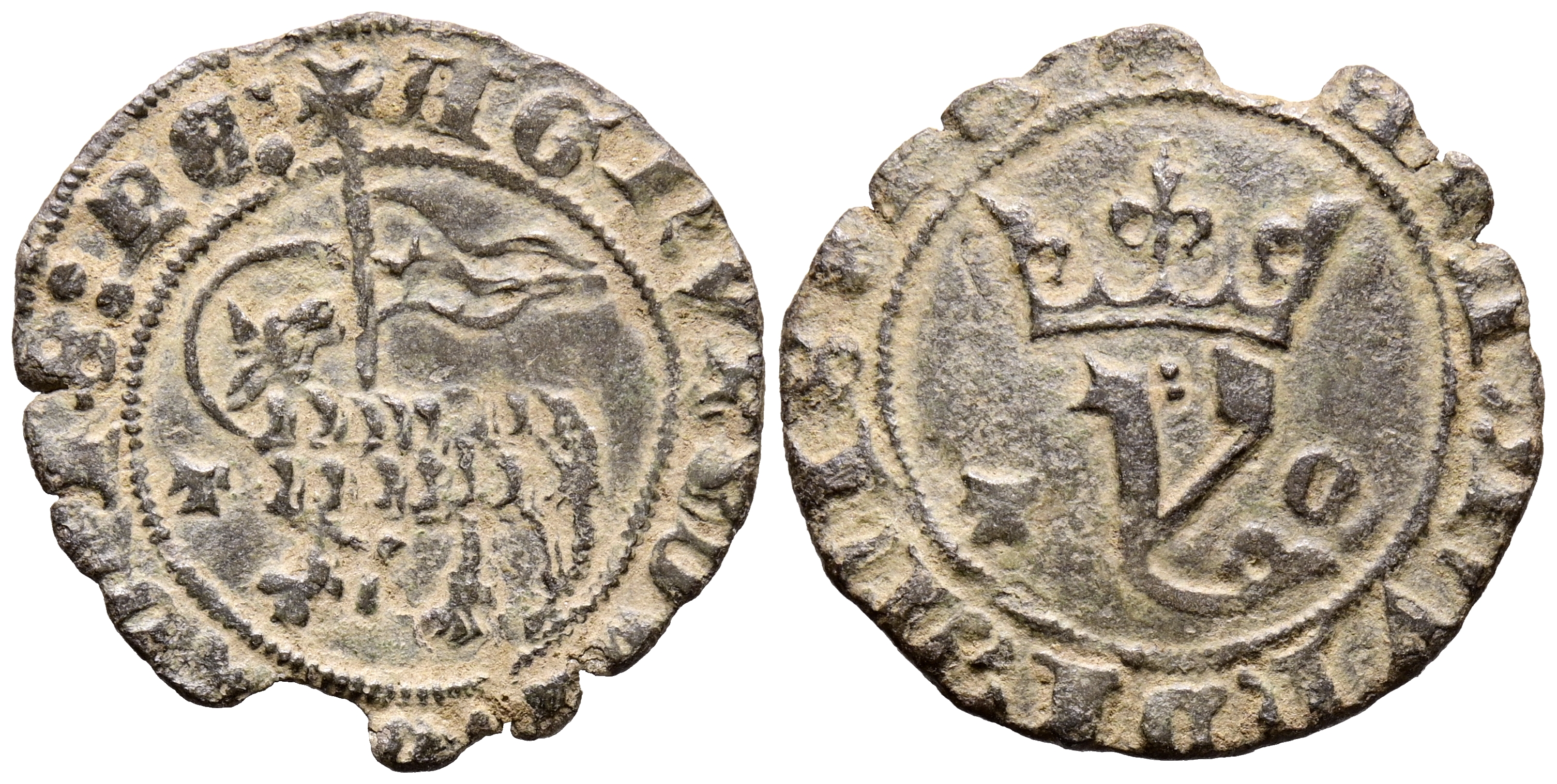 JUAN I (1379-1390). Blanca del Agnus Dei. (Ve. 1,14g/21mm). Toledo. (Imperatrix J1:9.6; FAB-557.1). Anv: Agnus Dei a izquierda con estandarte, delante: T, todo dentro de gráfila circular y alrededor leyenda: AGNVS DEI QVI TOLIS PE. Rev: Y coronada dentro de gráfila, entre: T -O, alrededor leyenda: CATA MVNDI MISERE N. MBC. Pequeña falta en cospel.