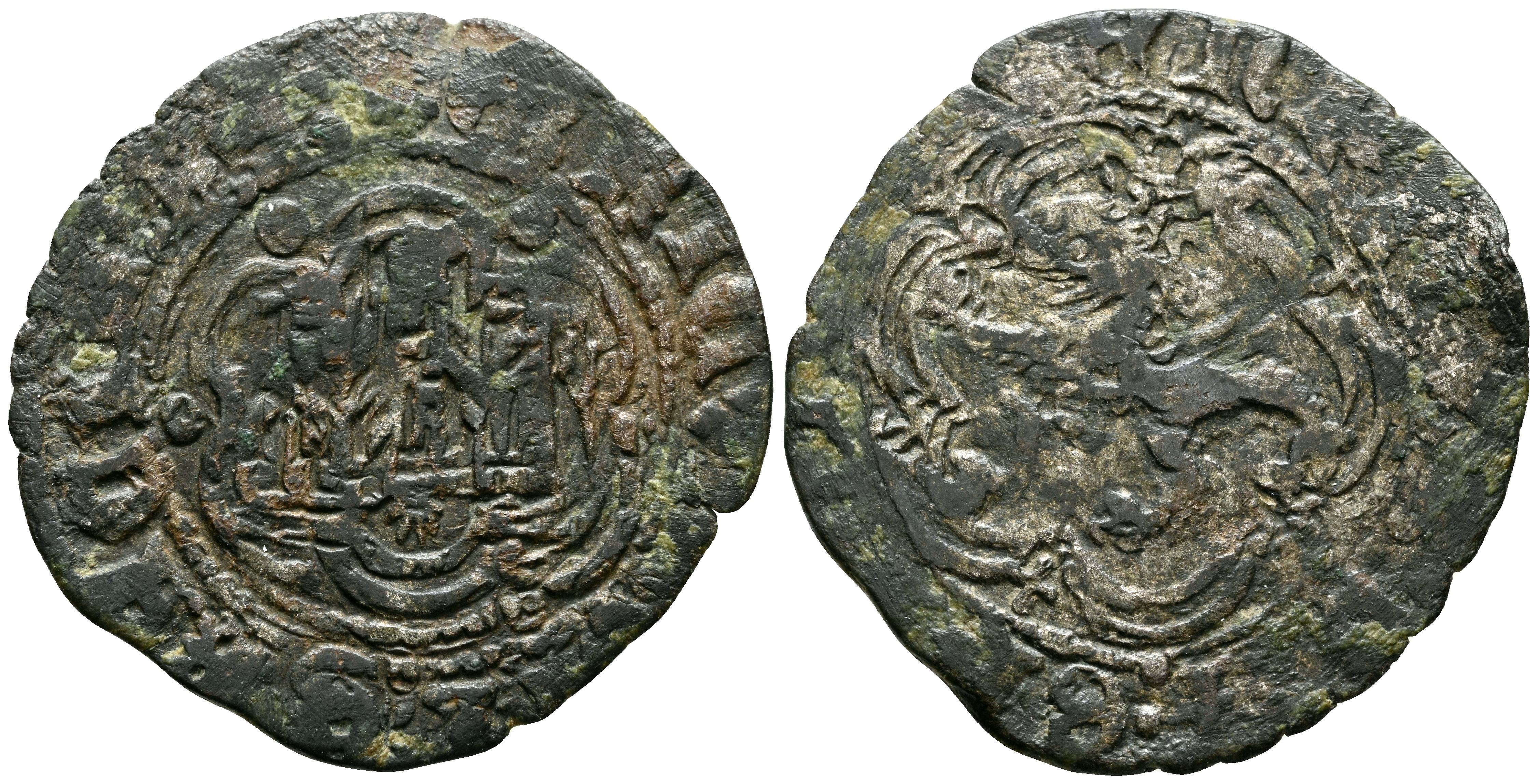 ENRIQUE III (1390-1406). Blanca. (Ae. 2,00g/23mm). Coruña. (FAB-599). Anv: Castillo, debajo cuenco, todo dentro de gráfila lobular, alrededor leyenda: ENRICVS DEI GRACIA. Rev: León rampante a izquierda dentro de gráfila lobular, alrededor leyenda: ENRICVS DEI GRACIA. MBC-.