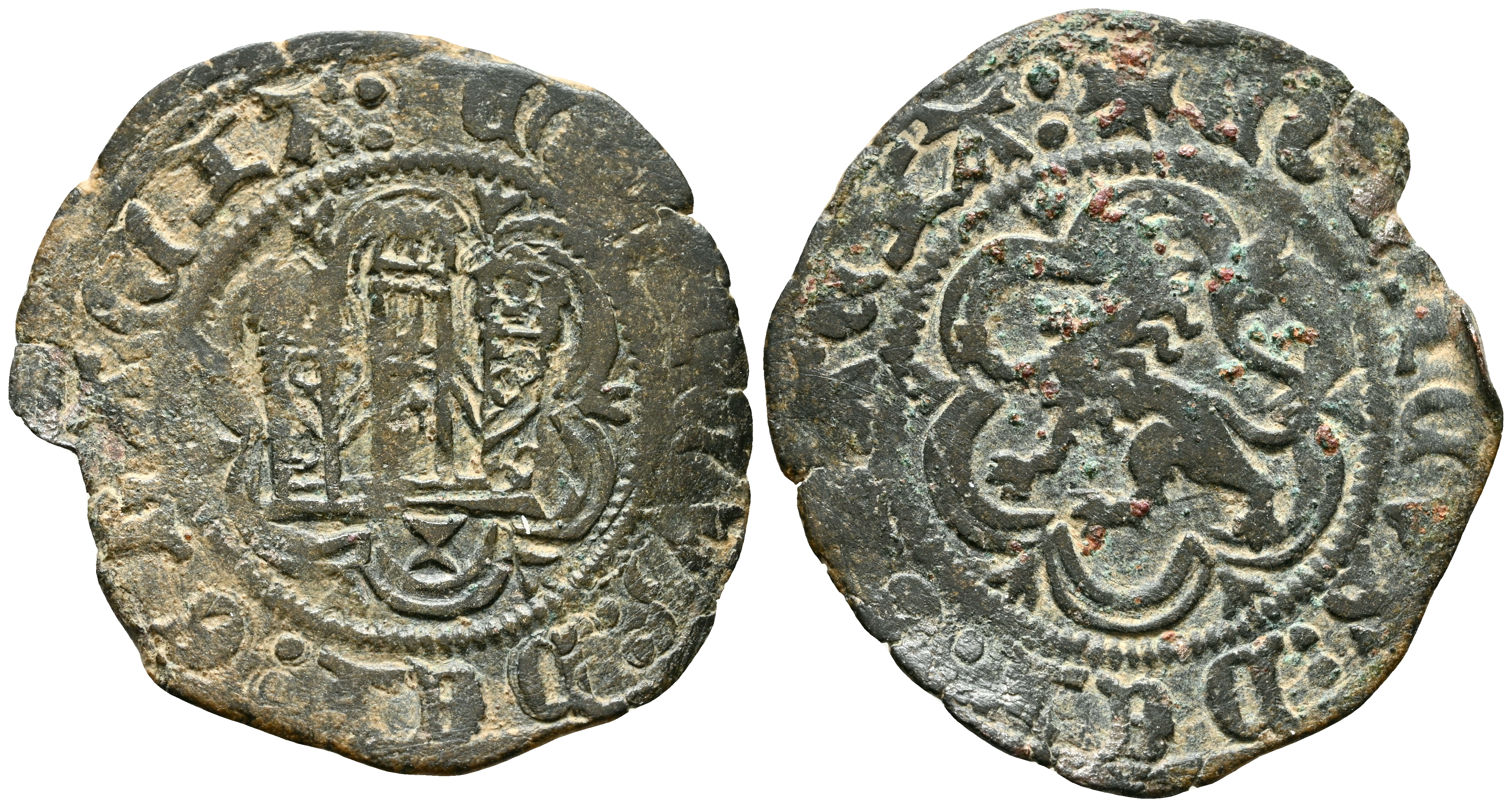 ENRIQUE III (1390-1406). Blanca. (Ae. 1,90g/24mm). Cuenca. (FAB-600). Anv: Castillo, debajo cuenco, todo dentro de gráfila lobular, alrededor leyenda: ENRICVS DEI GRACIA. Rev: León rampante a izquierda dentro de gráfila lobular, alrededor leyenda: ENRICVS DEI GRACIA. MBC.