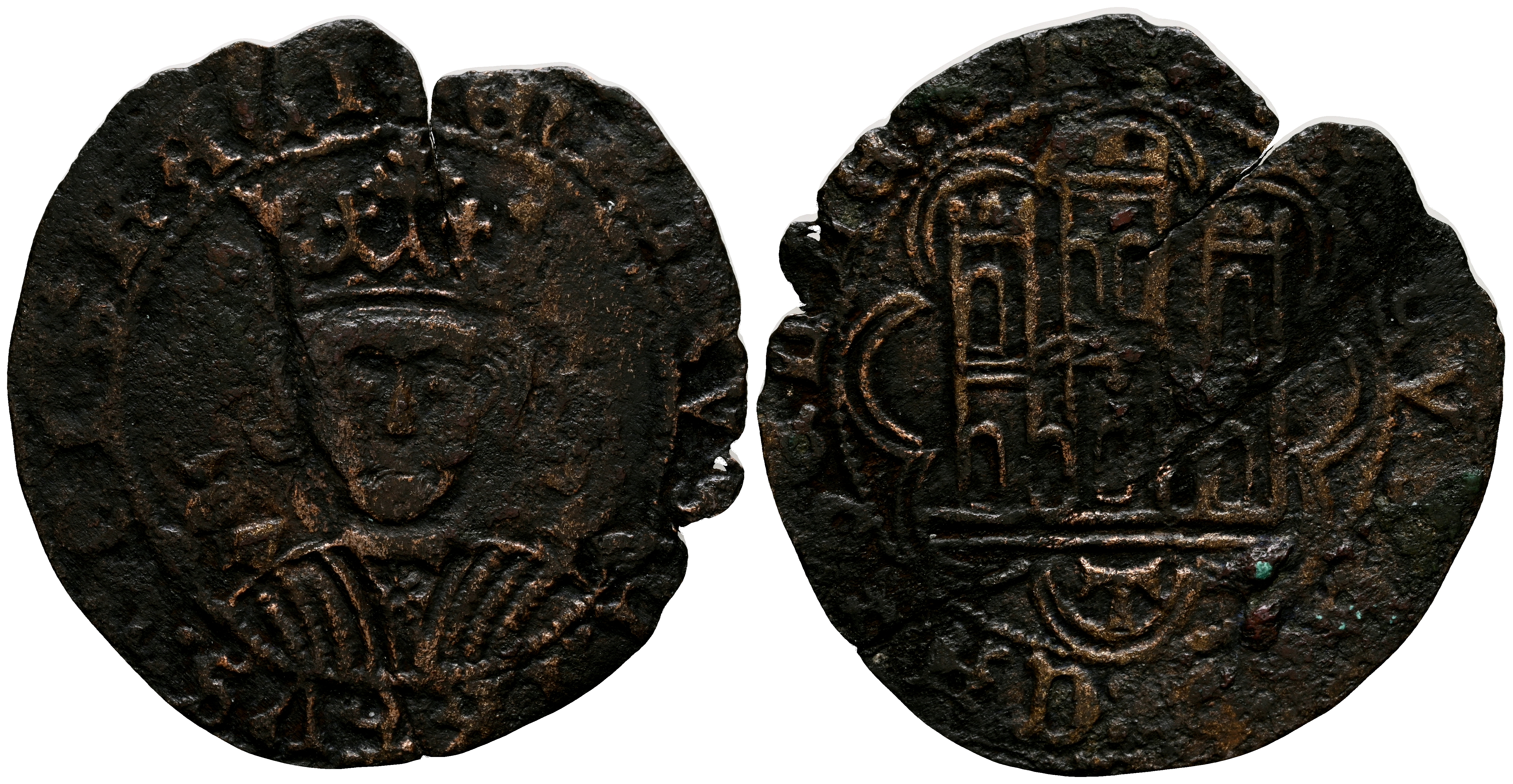 ENRIQUE IV (1454-1474). Cuartillo. (Ar. 1,64g/27mm). Toledo. (Momeca 75.A32.1; FAB-757). Anv: Busto coronado de Enrique IV de frente, en campo a los lados ramillete de granadas, todo dentro de una gráfila circular, alrededor leyenda: ENRICVS CARTVS DEI GRA. Rev: Castillo, debajo T, todo dentro a una doble gráfila polilóbular, a su vez rodeada de una circular, alrededor leyenda: ENRICVS REX CASTELLE ELE. MBC-. Oxidaciones.