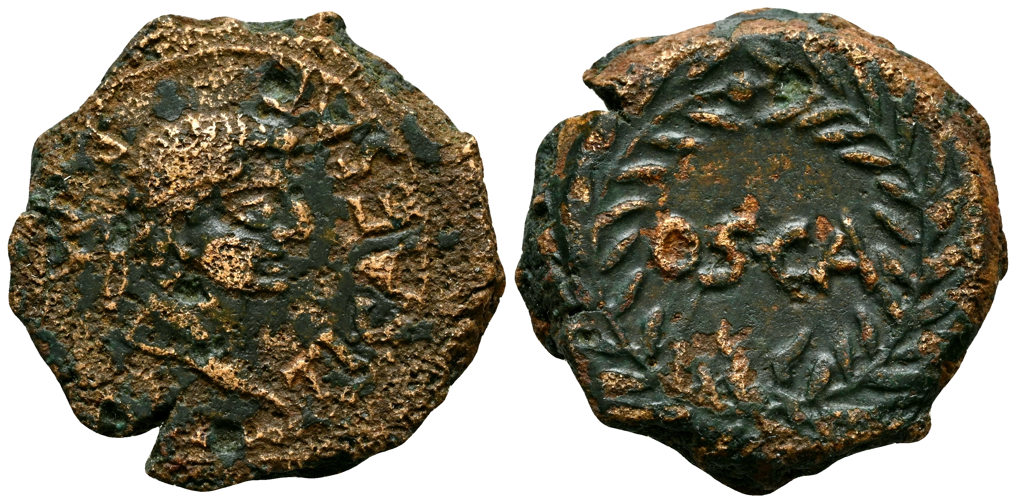OSCA (Huesca, Aragón). Cuadrante. (Ae. 3,45g/17mm). 14-36 d.C. (FAB-1940). Anv: Cabeza laureada de Tiberio a derecha, alrededor leyenda: TI CAESAR P P. Rev: Leyenda: OSCA, dentro de orla de puntos. MBC/MBC+. Escaso ejemplar. Ex colección Cores. Ex Jesus Vico, Subasta on-line 23 (16/04/2024), Nº Lote 154.