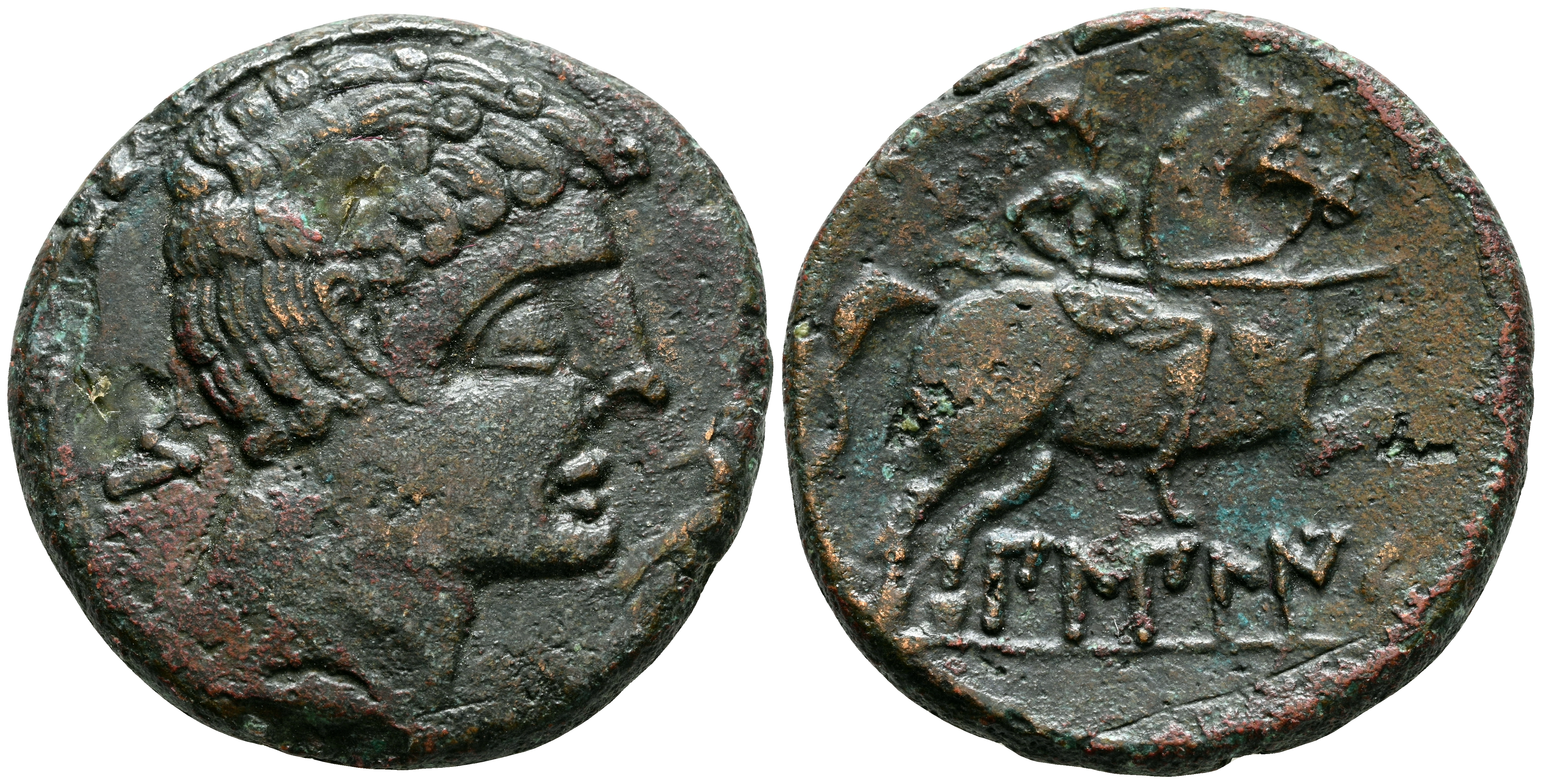 BILBILIS (Calatayud, Zaragoza). As. (Ae. 12,29g/27mm). 120-30 a.C. (FAB-254). Anv: Cabeza masculina a derecha, detrás letra S, delante delfín. Rev: Jinete con lanza a derecha, debajo leyenda ibérica sobre línea: BiLBiLIS. MBC.