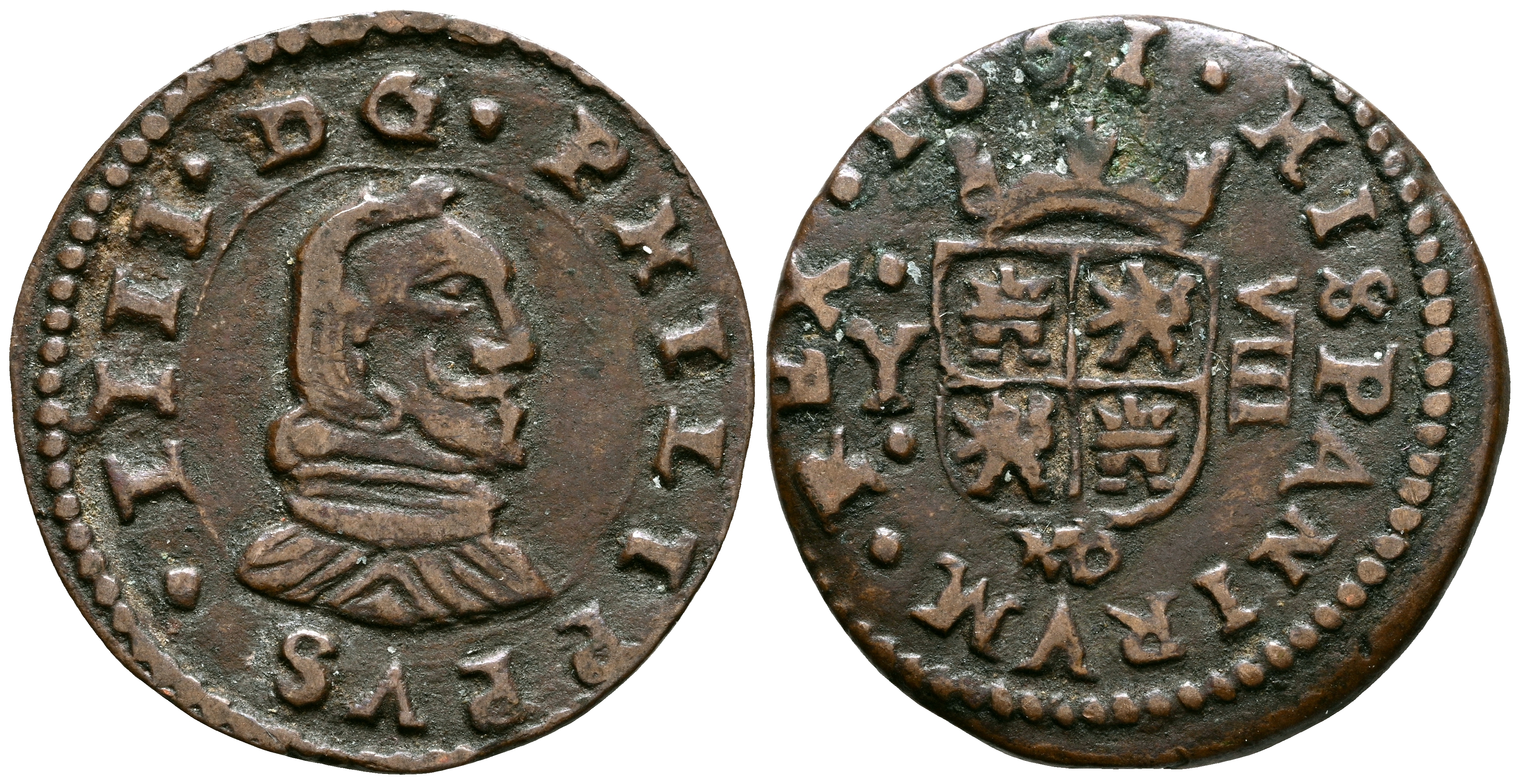 FELIPE IV (1621-1665). 8 Maravedís. (Ae. 2,22g/21mm). 1661. Madrid Y. (Cal-2019-358). Marca de ceca MD debajo del escudo. Error de leyenda: HISPANIRVM MBC.