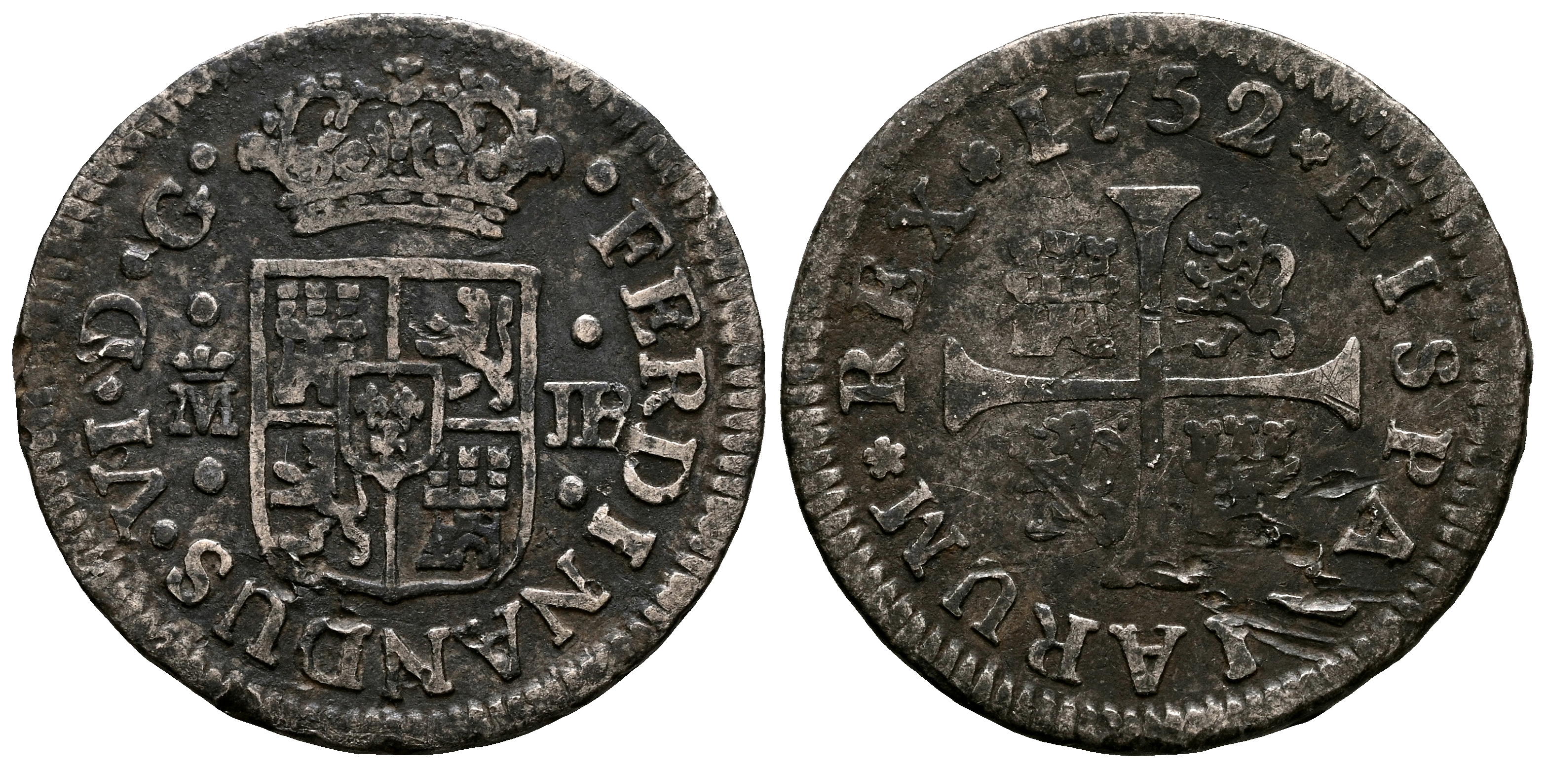 FERNANDO VI (1746-1759). 1/2 Real. (Ar. 1,31g/15mm). 1752. Madrid JB. (Cal-2019-71). BC+.