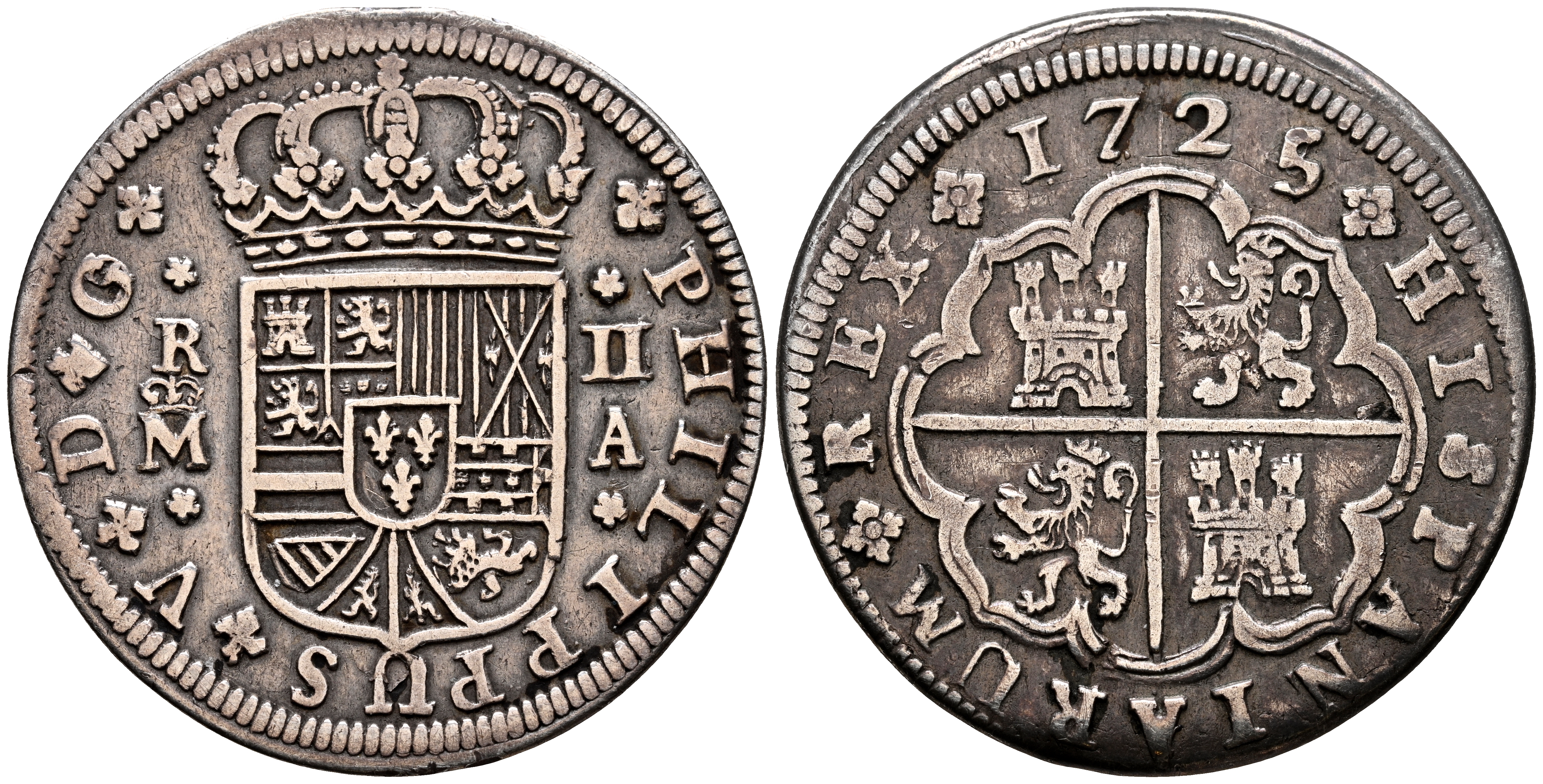 FELIPE V (1700-1746). 2 Reales. (Ar. 5,63g/28mm). 1725/4. Madrid A. (Cal-2019-779). MBC. Bonito tono.