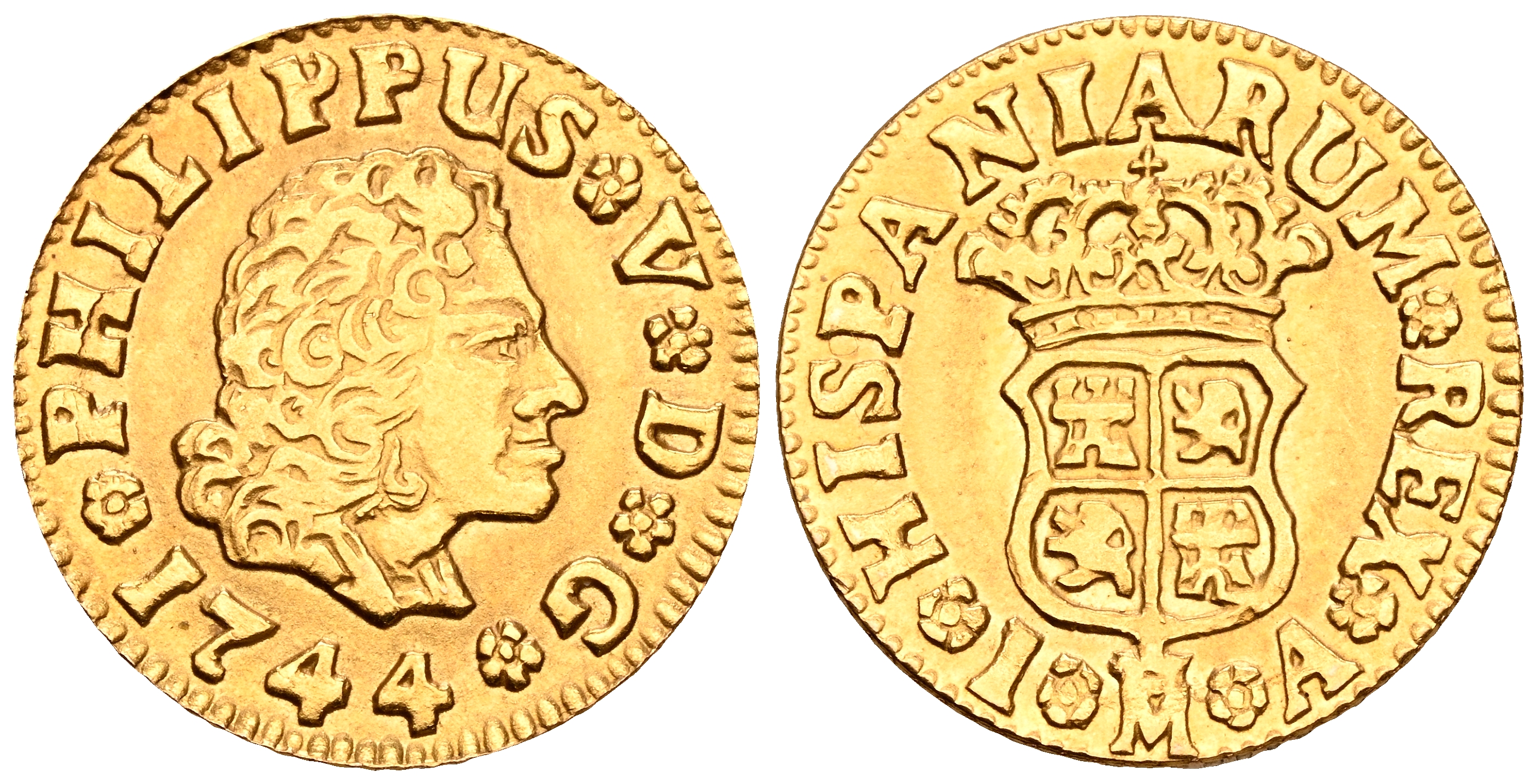 FELIPE V (1700-1746). 1/2 Escudo. (Au. 1,66g/15mm). 1744. Madrid JA. Réplica de joyería. Oro 0,700 milésimas. SC.