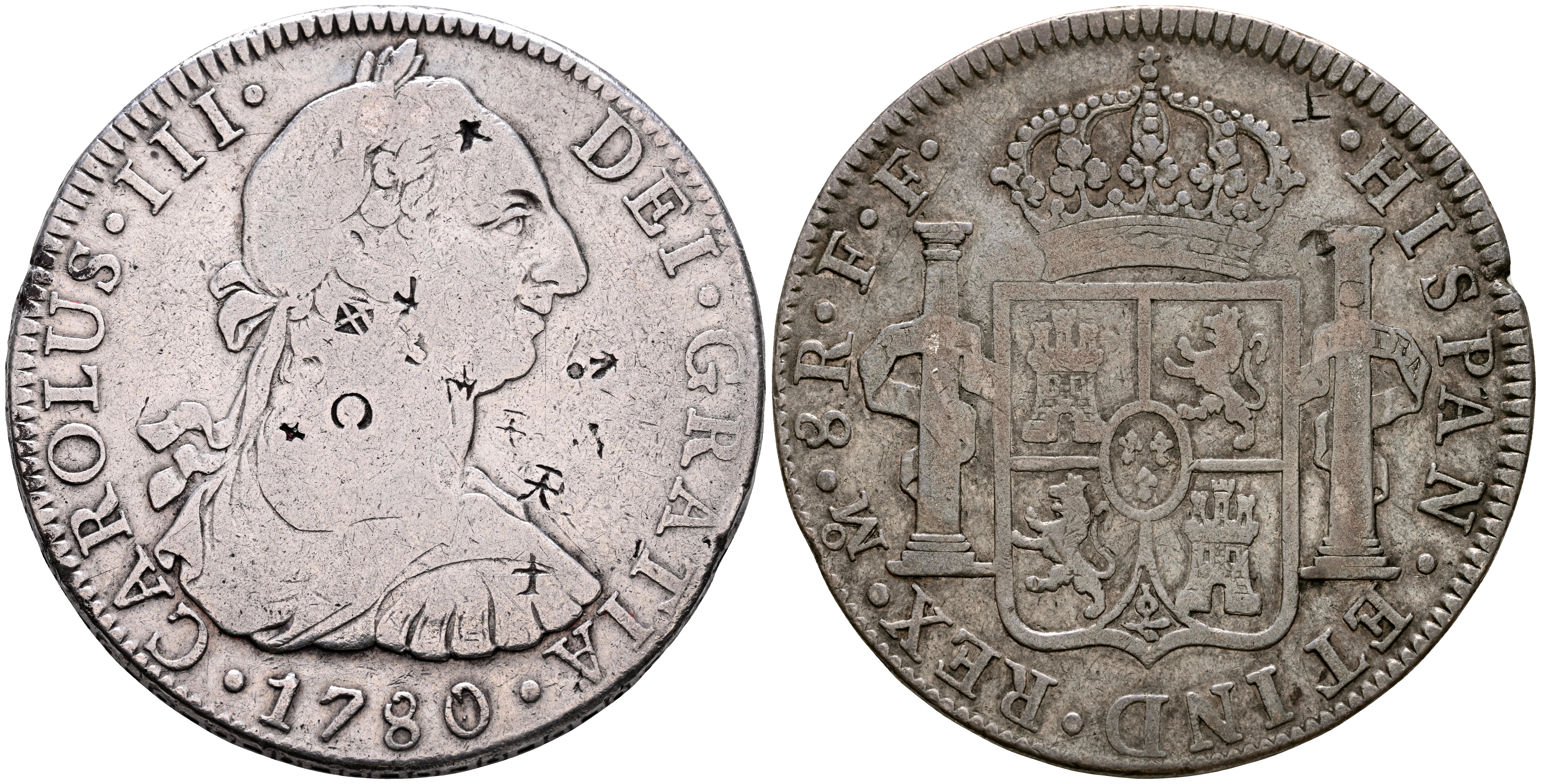 CARLOS III (1759-1788). 8 Reales. (Ar. 26,59g/39mm). 1780. México FF. (Cal-2019-1120). MBC-. Resellos orientales.
