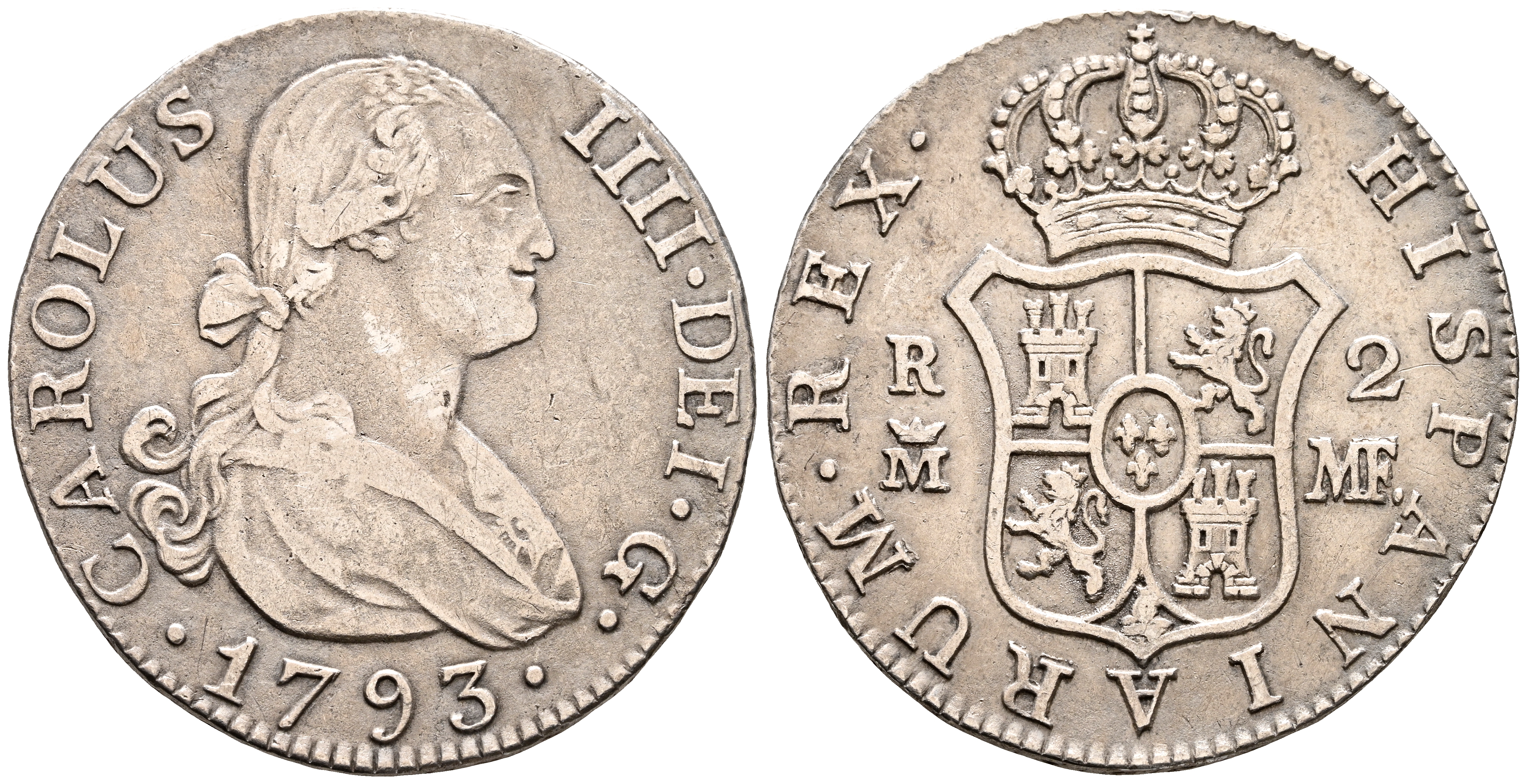 CARLOS IV (1788-1808). 2 Reales. (Ar. 5,92g/26mm). 1793. Madrid MF. (Cal-2019-600). MBC.