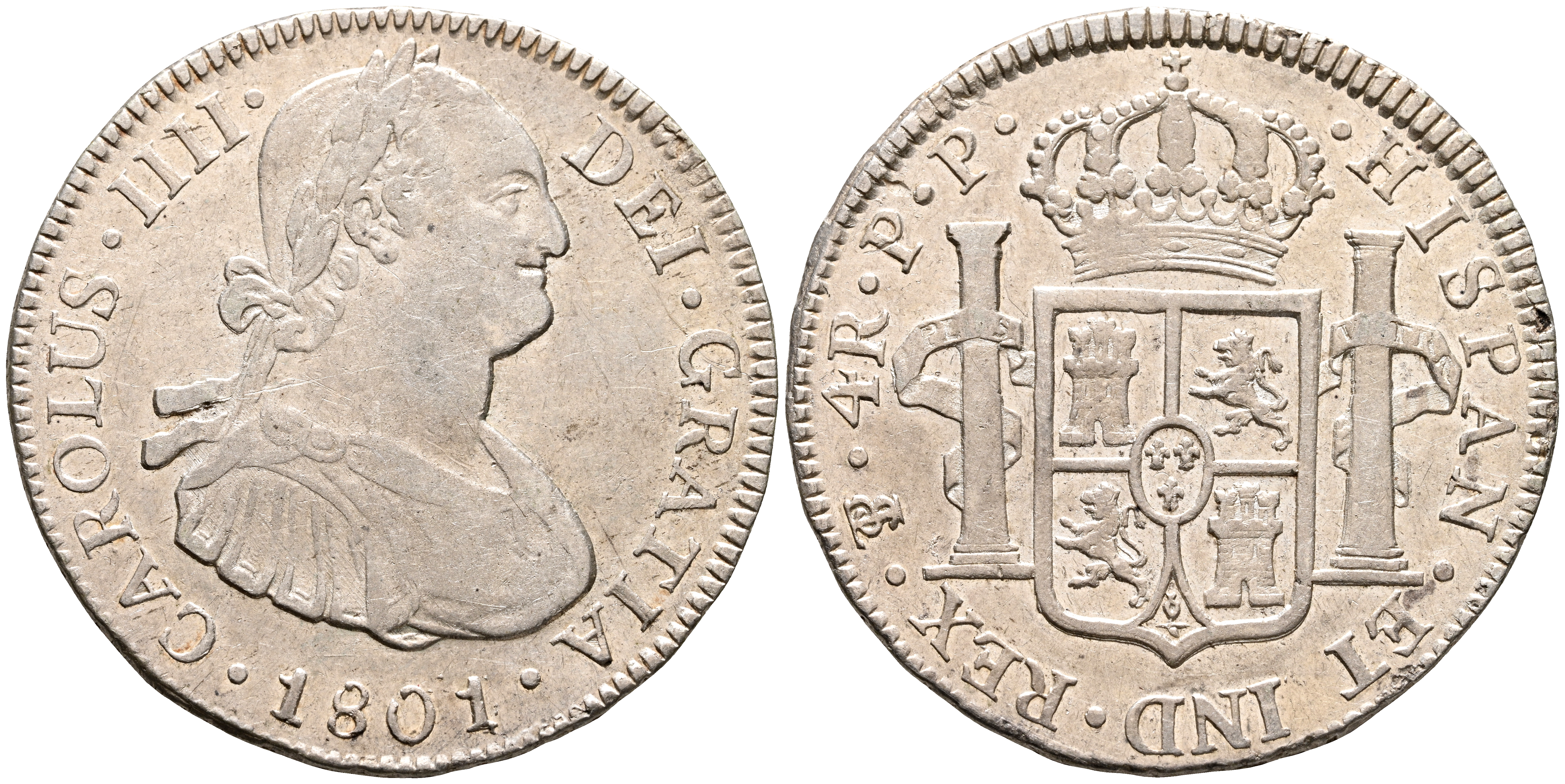 CARLOS IV (1808-1833). 4 Reales. (Ar. 13,38g/34mm). 1801. Potosí PP. (Cal-2019-836). EBC-. Restos de brillo original. Escasa así.
