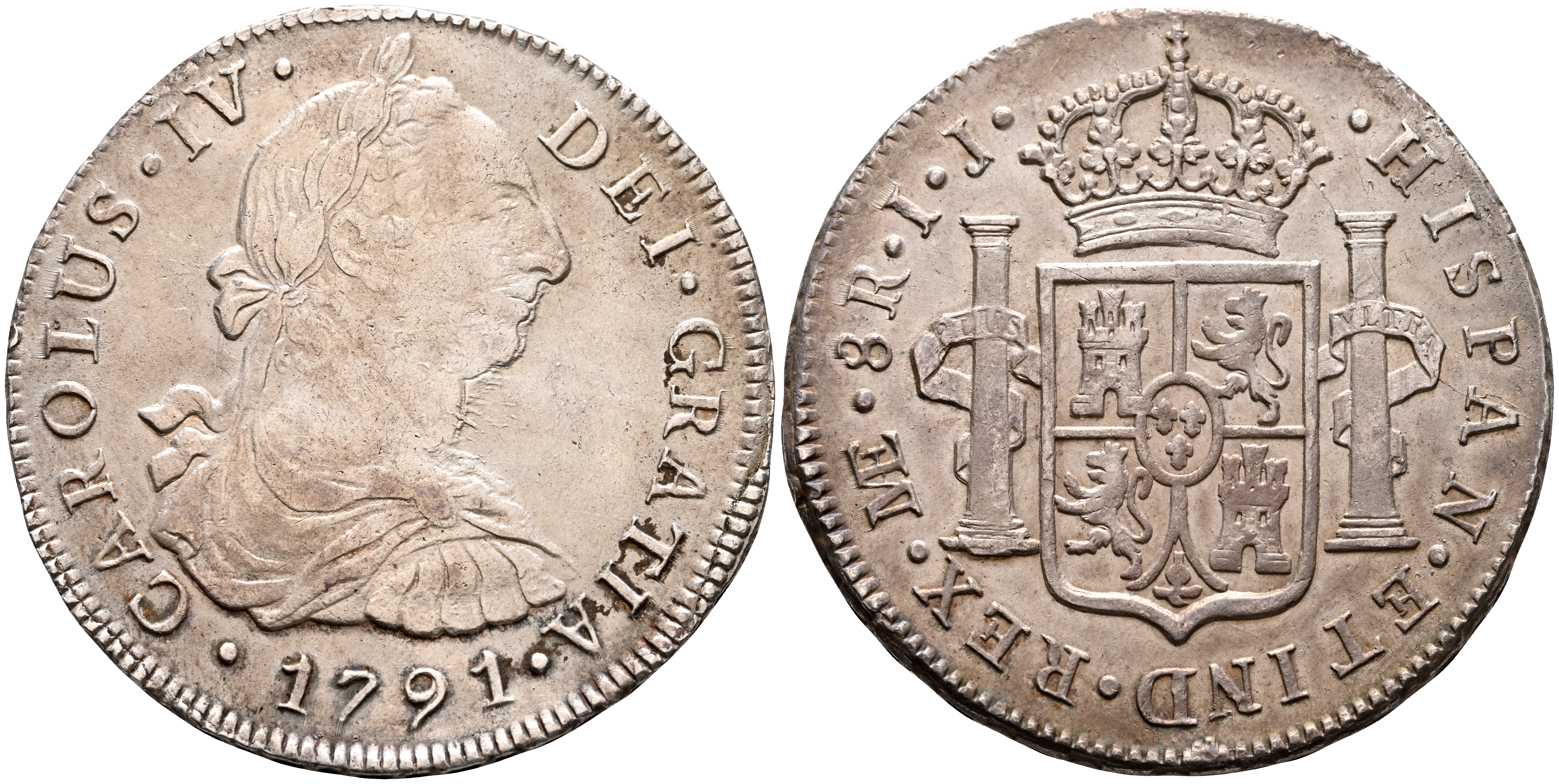 CARLOS IV (1788-1808). 8 Reales. (Ar. 26,76g/40mm). 1791. Lima IJ. (Cal-2019-905). Busto de Carlos III. MBC/MBC+. Escasa.