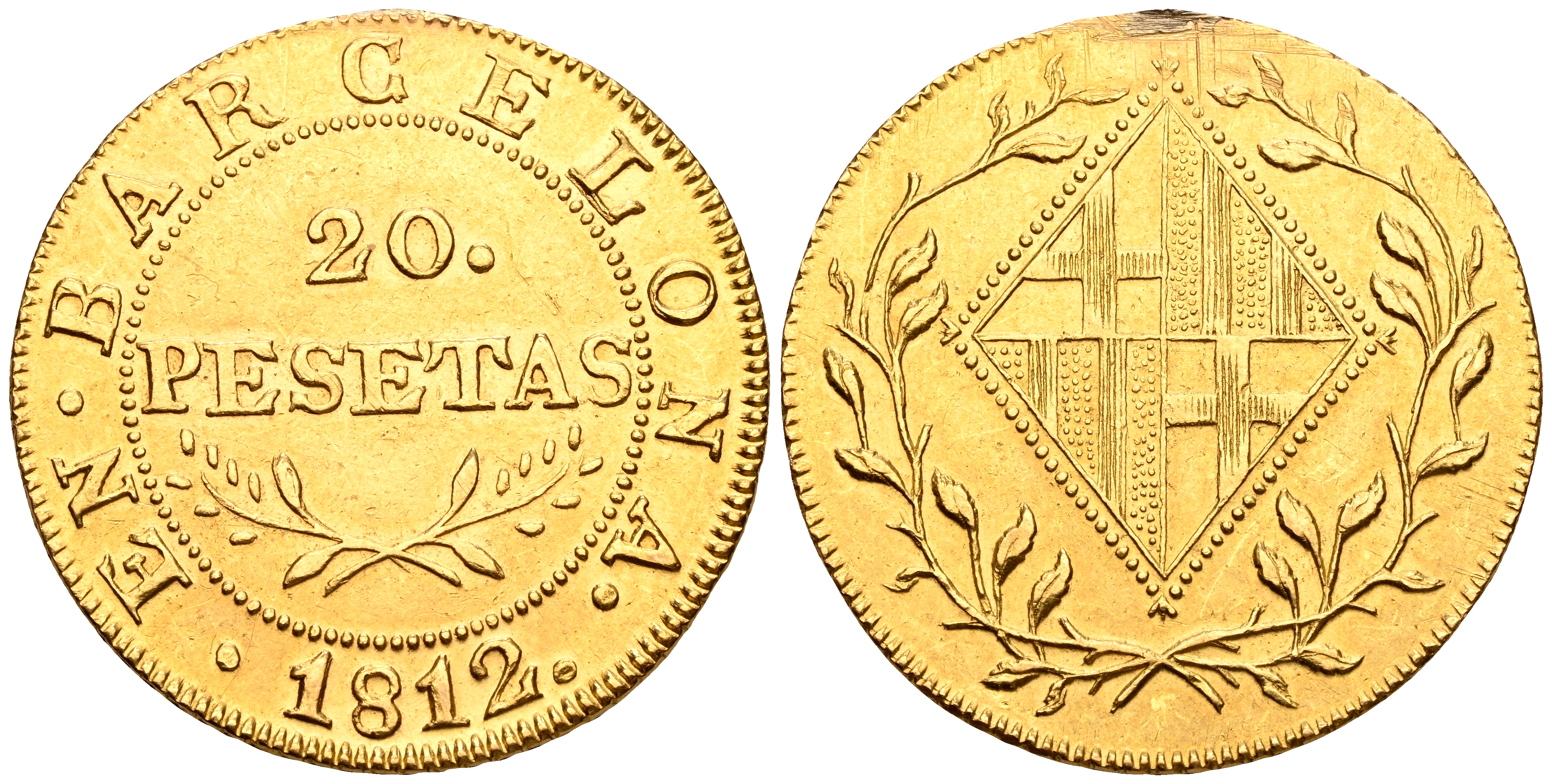 CATALUÑA NAPOLEÓNICA (1808-1814). 20 Pesetas. (Au. 6,65g/22mm). 1812. Barcelona. (Cal-2019-54). MBC+. Restos de soldadura en canto.