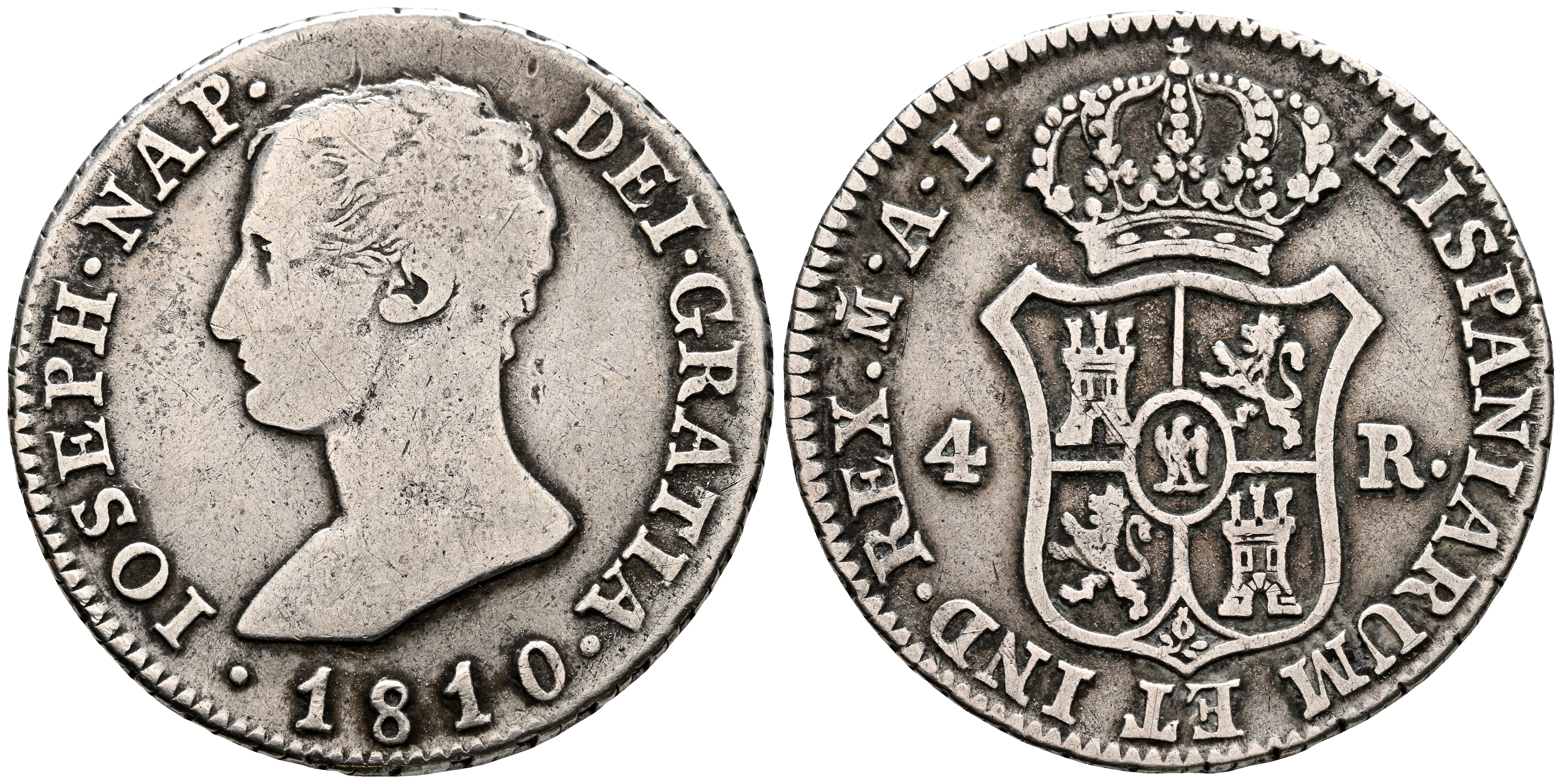 JOSÉ NAPOLEÓN (1808-1813). 4 Reales. (Ar. 5,84g/26mm). 1810. Madrid AI. (Cal-2019-14). MBC-/MBC.