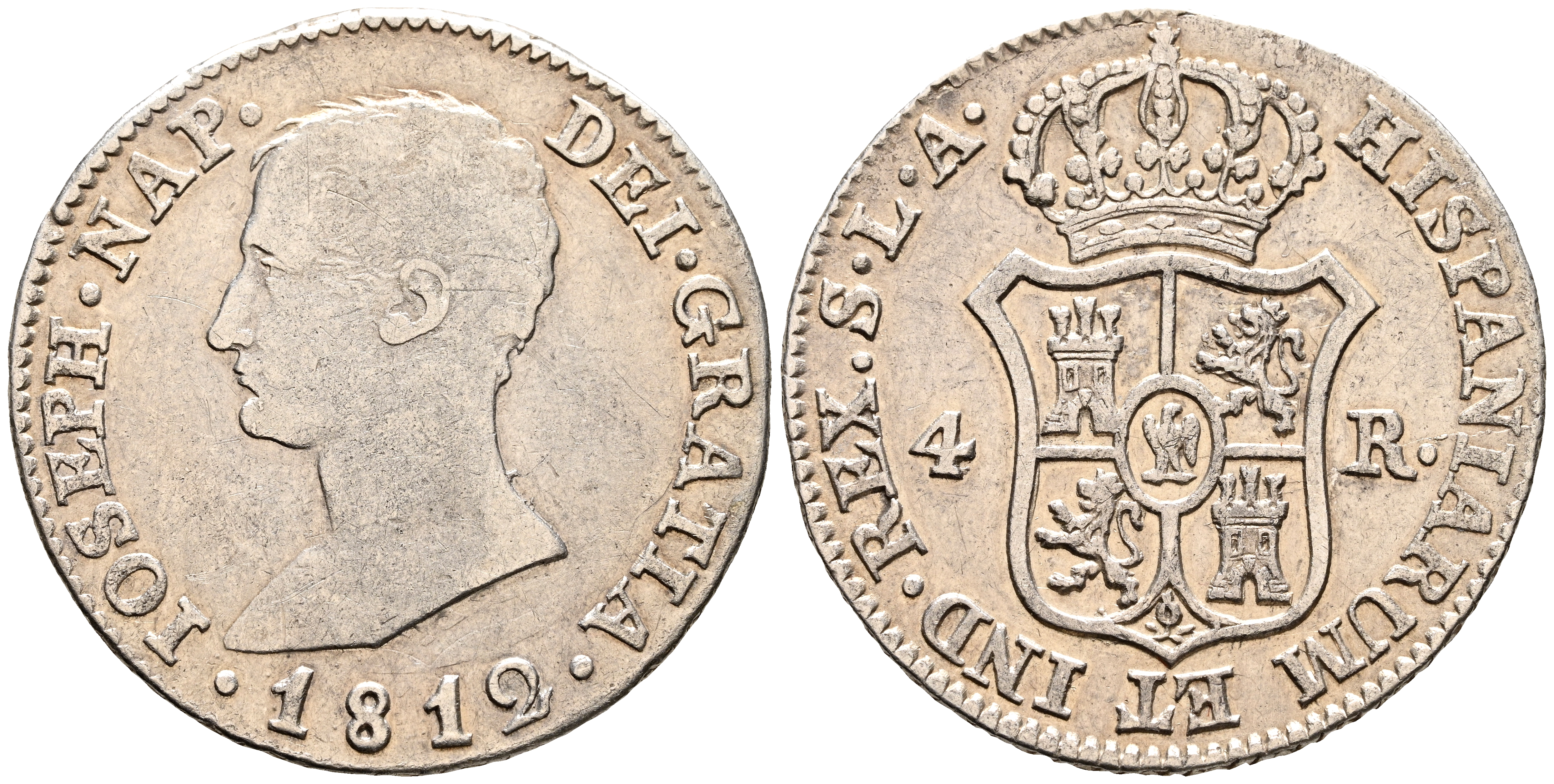 JOSÉ NAPOLEÓN (1808-1813). 4 Reales. (Ar. 5,80g/26mm). 1812. Sevilla LA. (Cal-2019-25). MBC/MBC+. Leves restos de brillo original.