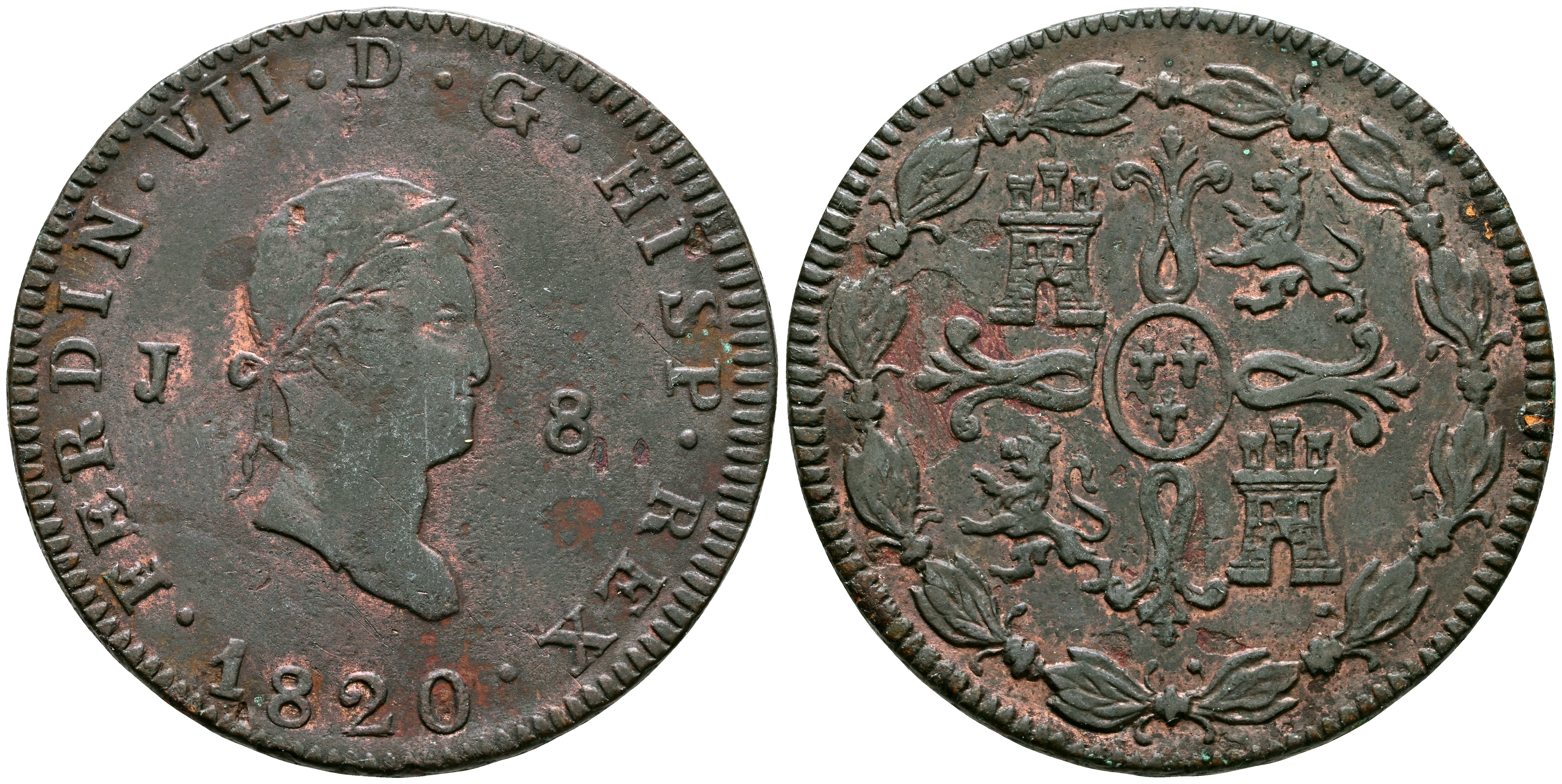 FERNANDO VII (1808-1833). 8 Maravedís. (Ae. 10,08g/31mm). 1820. Jubia. (Cal-2019-200). Busto laureado. MBC+.