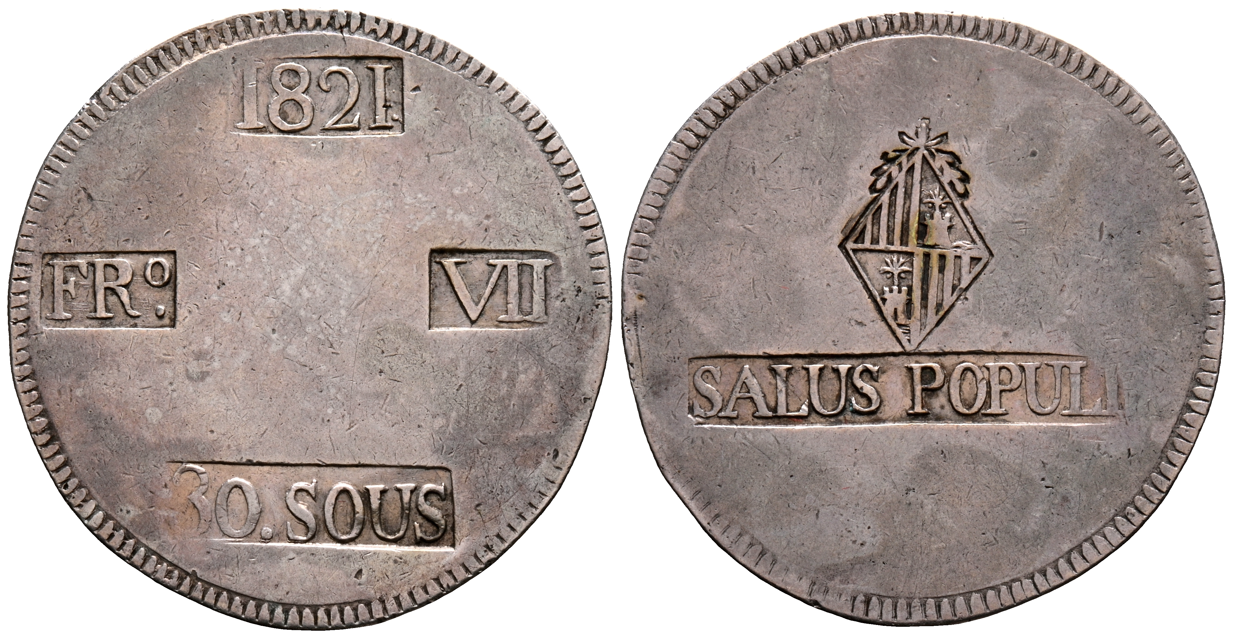 FERNANDO VII (1808-1833). 30 Sous. (Ar. 26,53g/41mm). 1821. Mallorca. (Cal-2019-1293). MBC+.